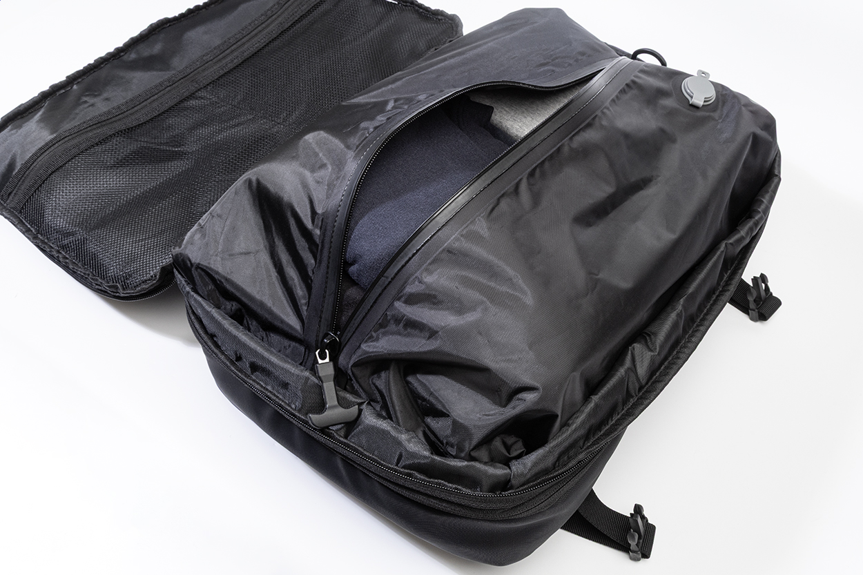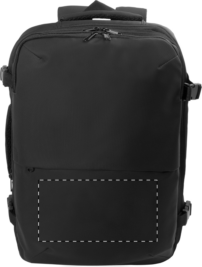 Vízálló, bővíthető kompressziós hátizsák cipzáras rekeszekkel, beépített vákuumos kompressziós rekesszel, párnázott laptop (15") rekesszel és cipzáras elülső zsebbel. Oldalsó csatokkal, bőrönd pánttal, párnázott hát- és vállpántokkal. PU bevonatú 600D poliészterből. Tartalmaz egy vákuumpumpát USB újratölthető akkumulátorral (1500 mAh).