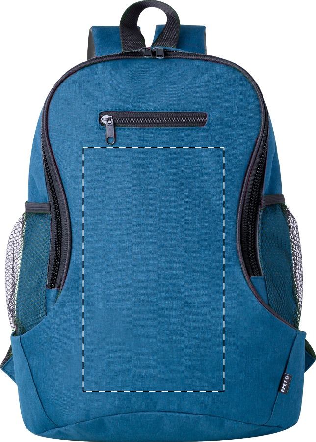 RPET hátizsák cipzáras rekesszel és elülső zsebbel, hálós oldalzsebekkel, párnázott hát- és vállpánttal. 300D RPET poliészter, megkülönböztető RPET címkével.