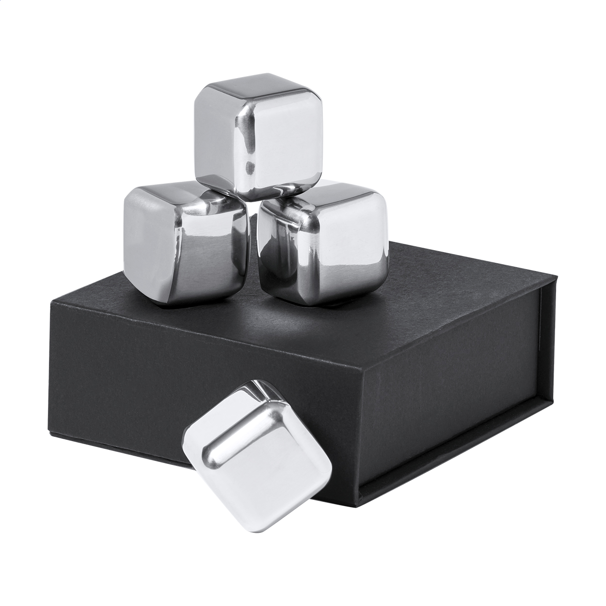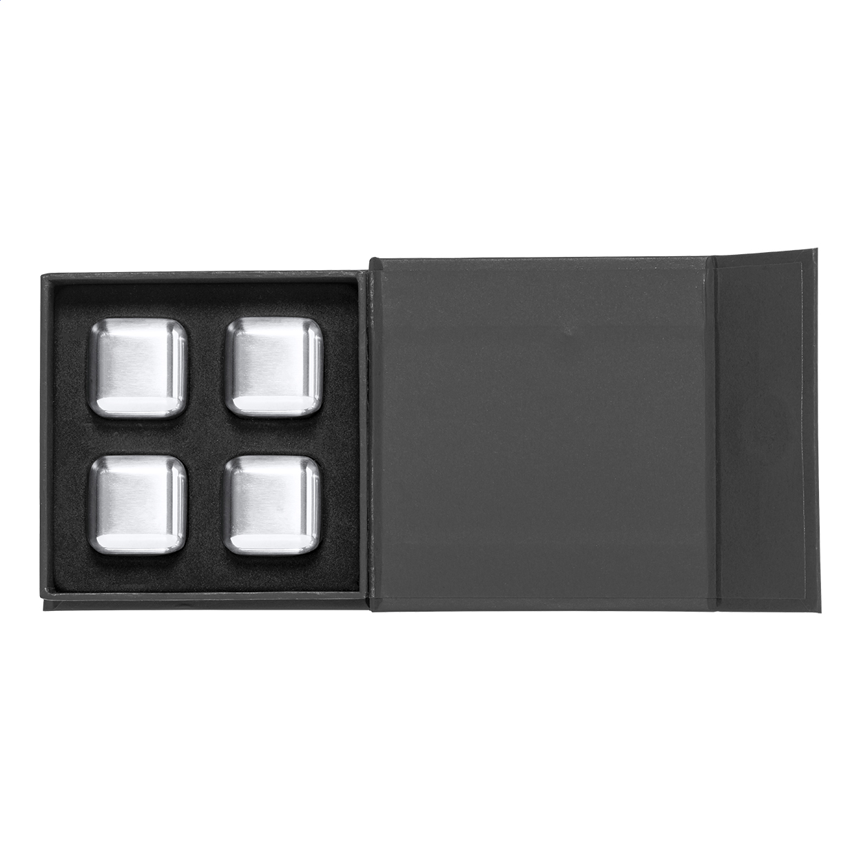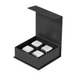 4 db-os újrahasználható, rozsdamentes acél jégkocka szett fekete díszdobozban.