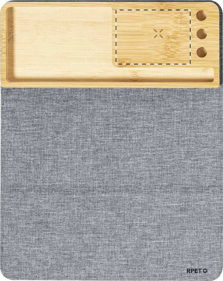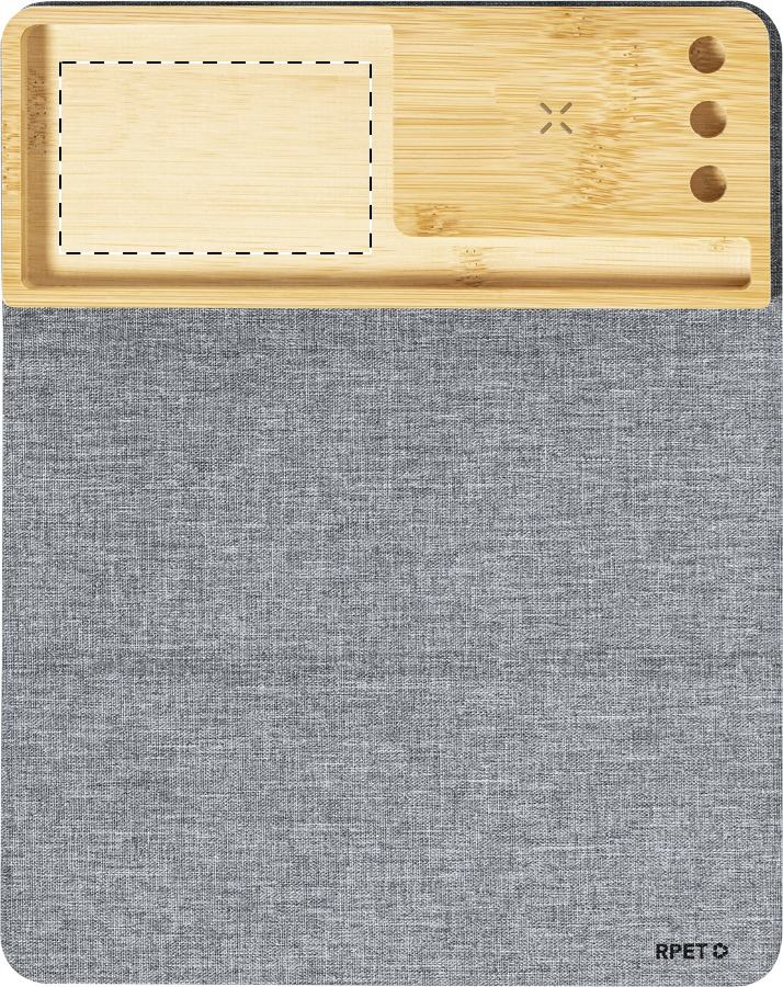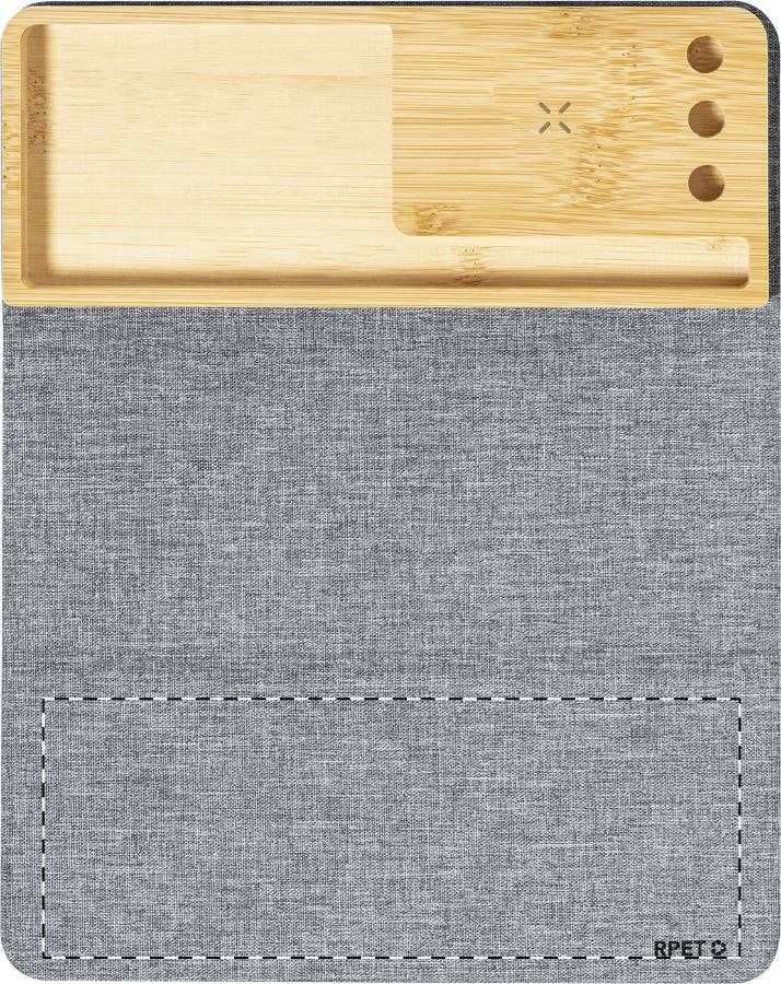 Összecsukható RPET poliészter egérpad szilikon alappal. Beépített vezeték nélküli gyorstöltővel (15W) és bambusz mobiltelefon-tartóval. 300D RPET poliészter. USB töltőkábellel szálíltjuk.