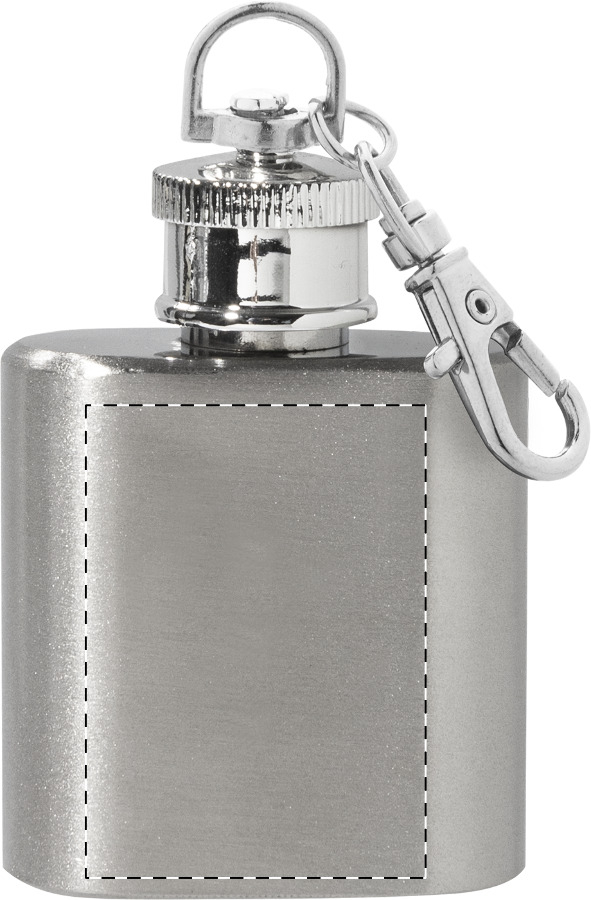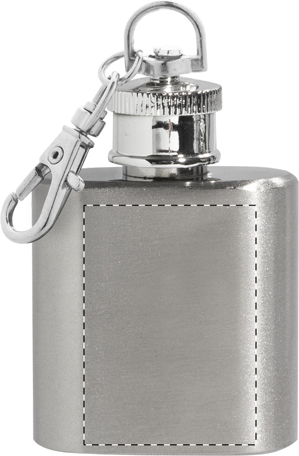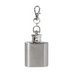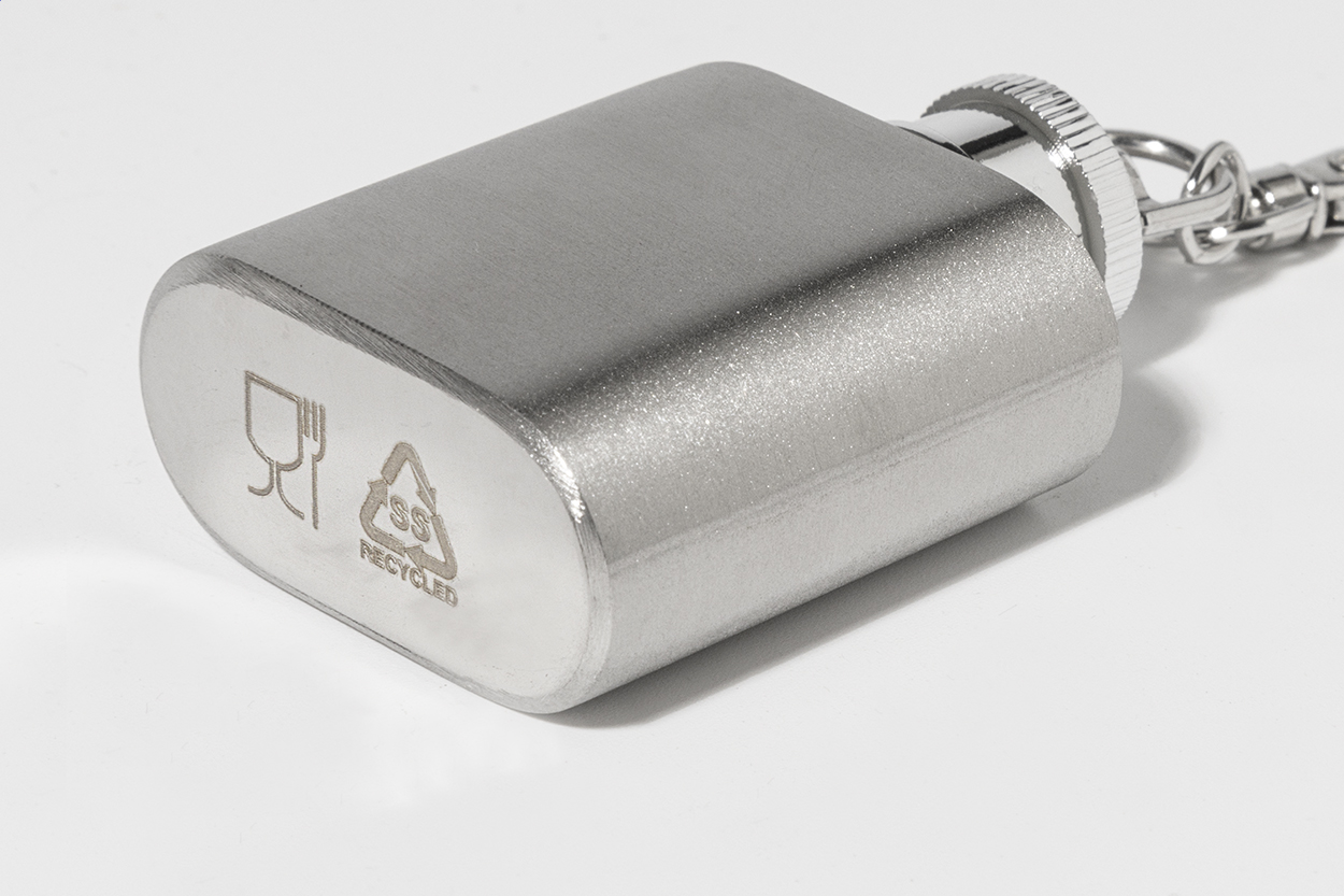 Újrahasznosított rozsdamentes acél mini flaska karabineres kulcstartóval. 30 ml.