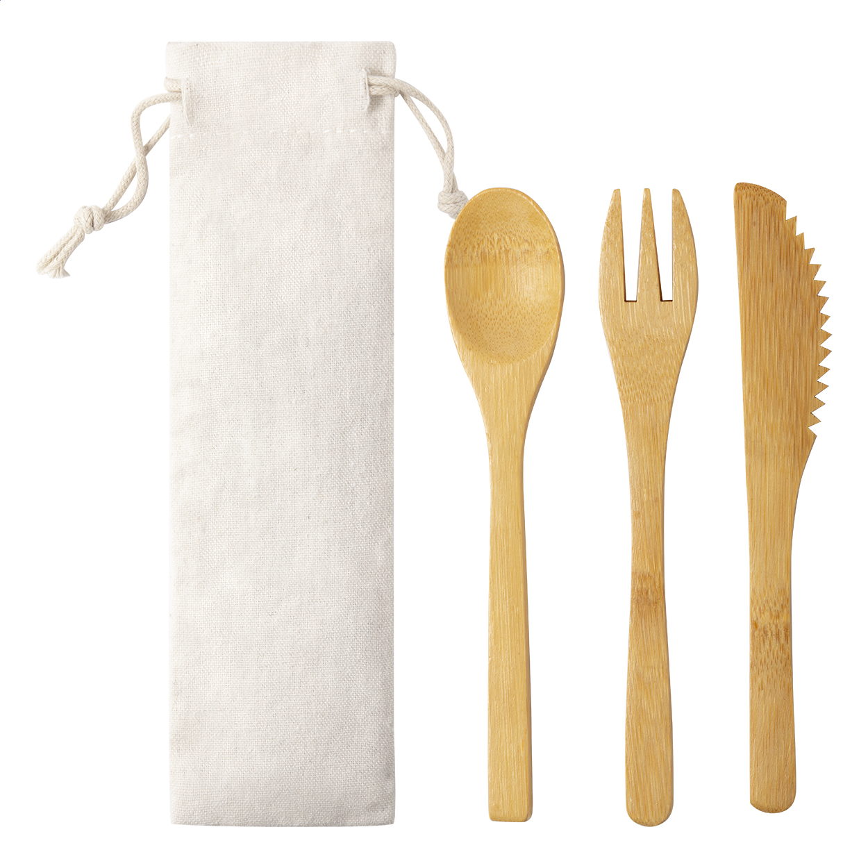 3 darabos bambusz evőeszköz szett pamut zacskóban.
