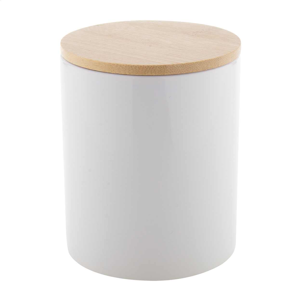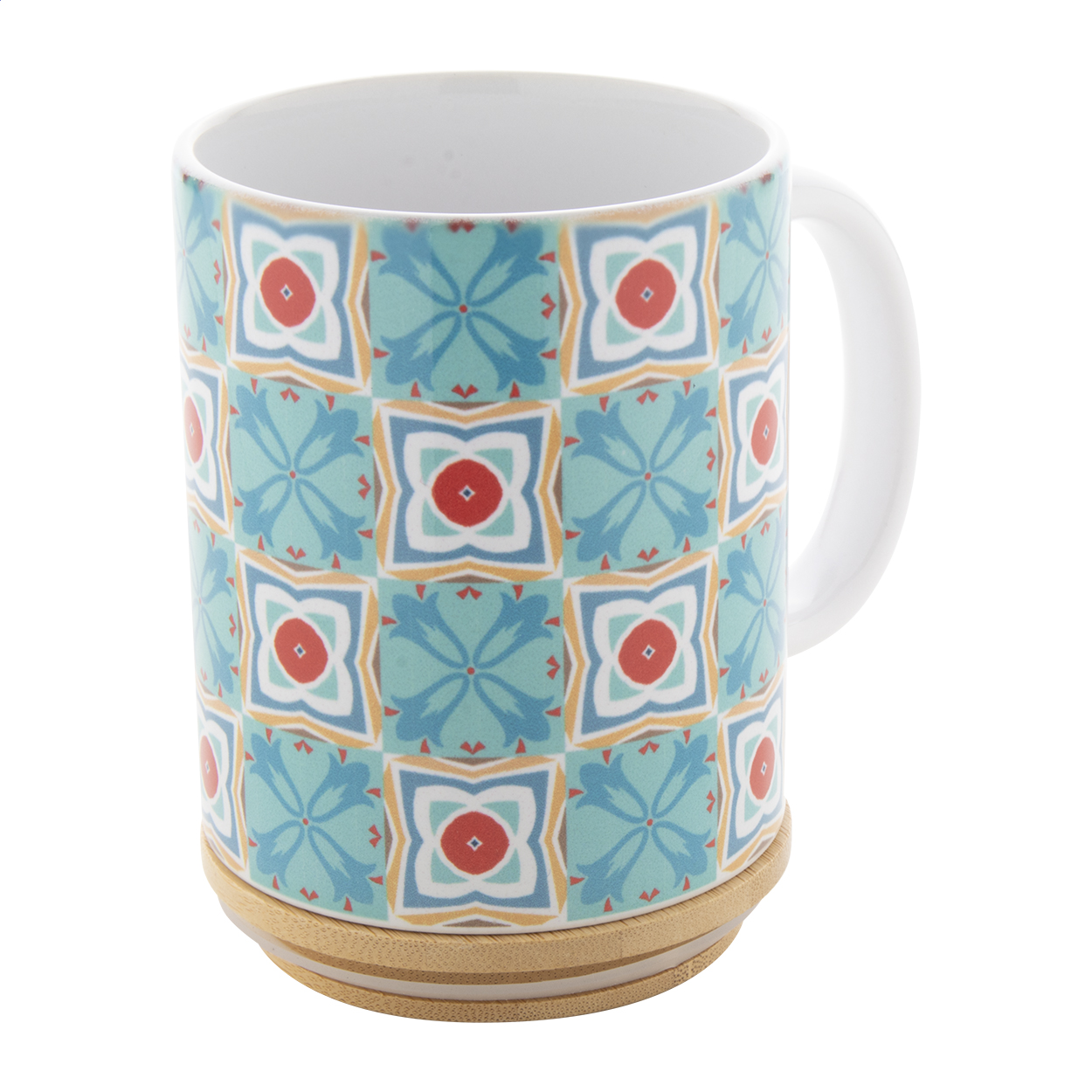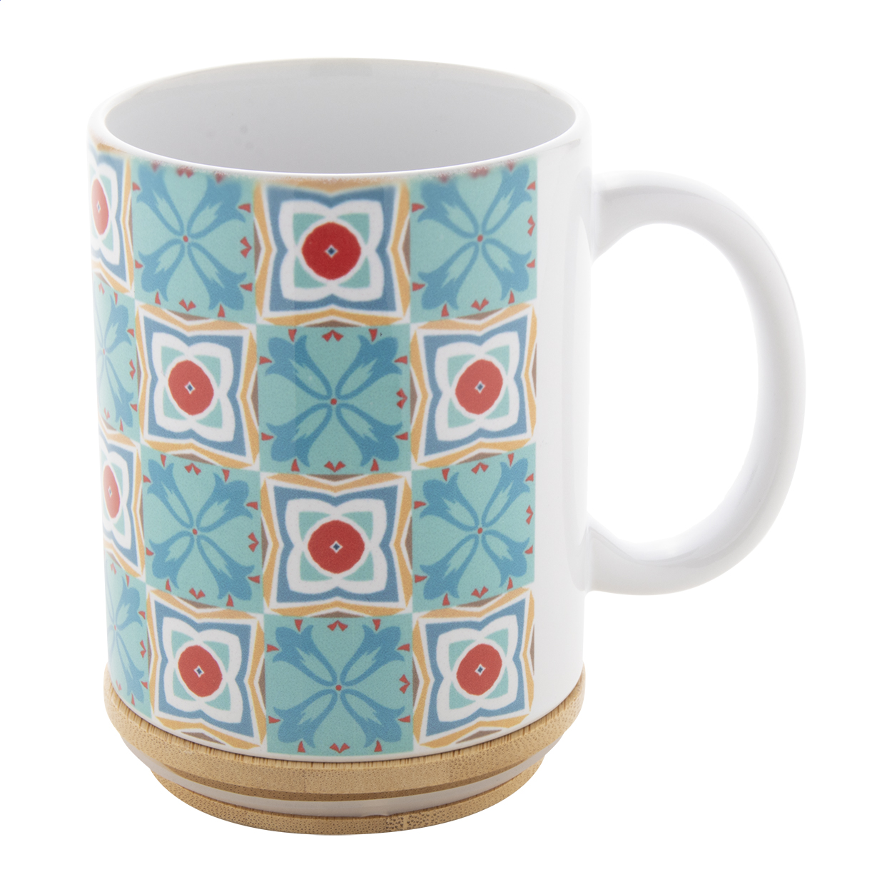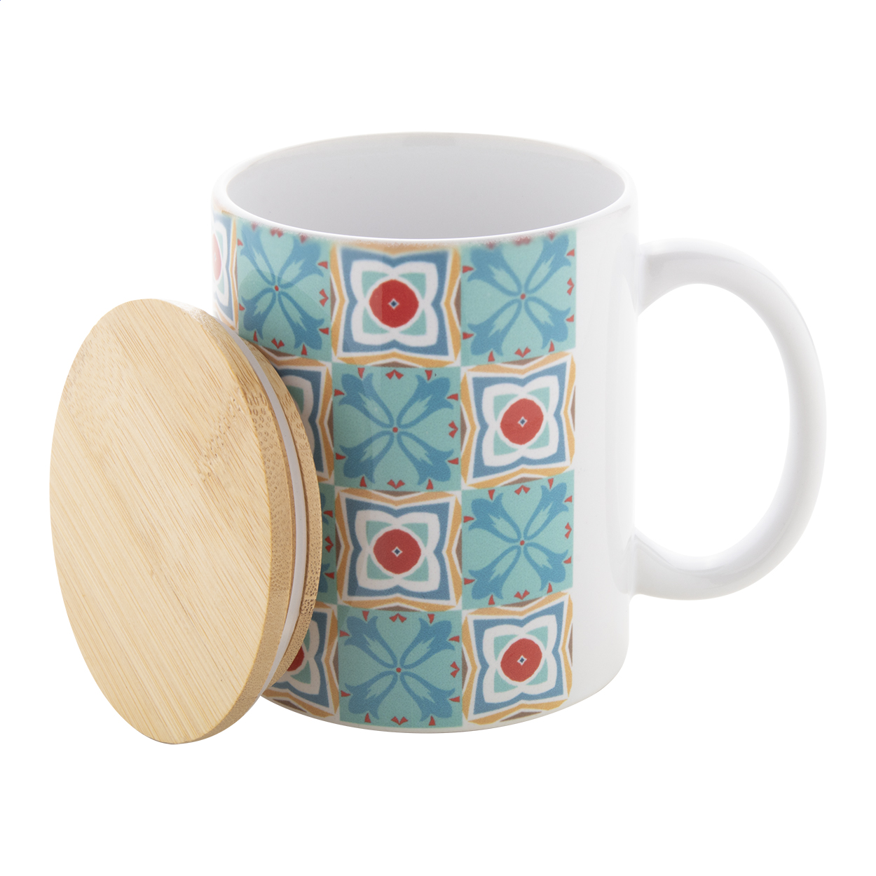 Mosogatógépben mosható fehér kerámia bögre bambuszfedéllel, szublimációs emblémázáshoz, 300 ml. Kraft papír dobozban szállítjuk.