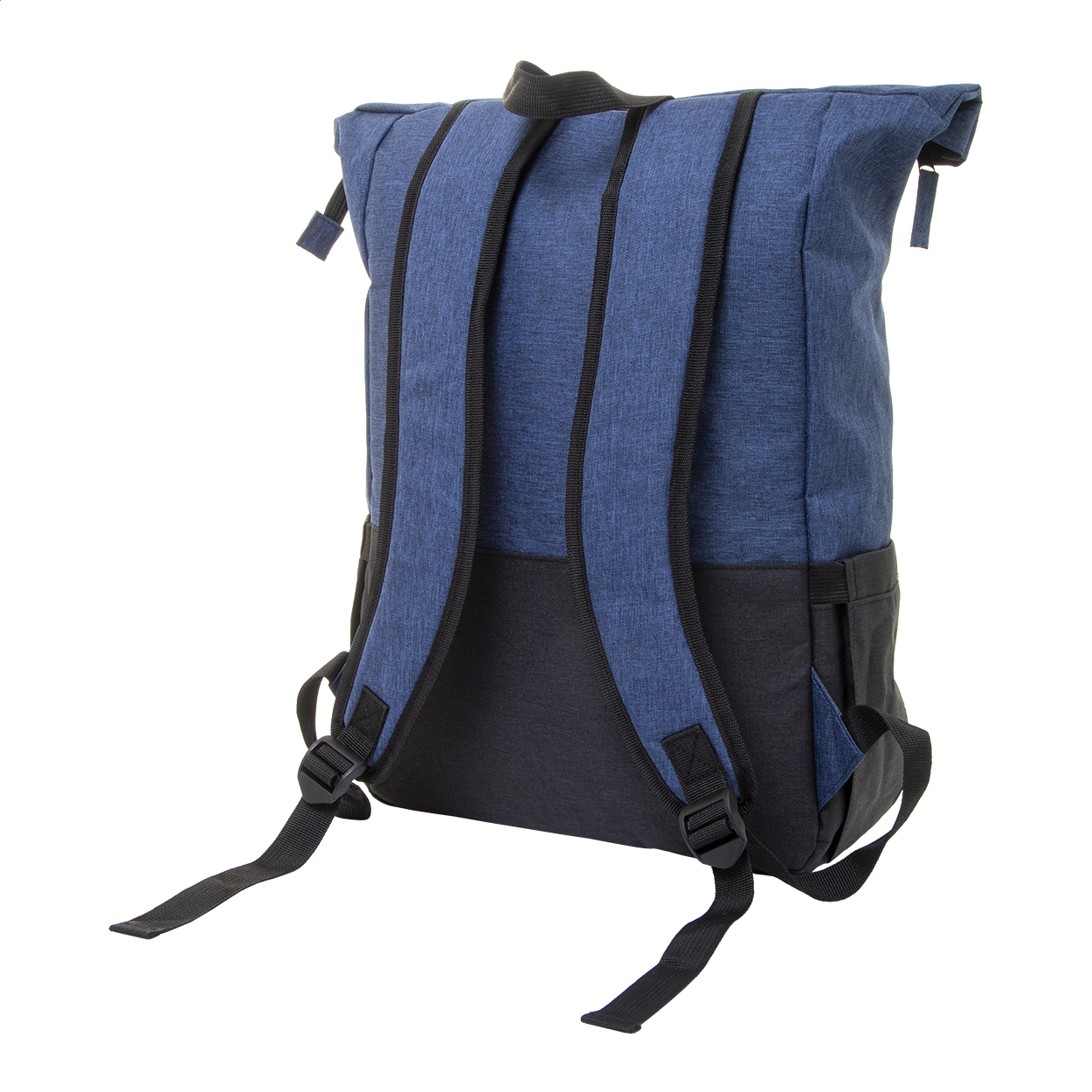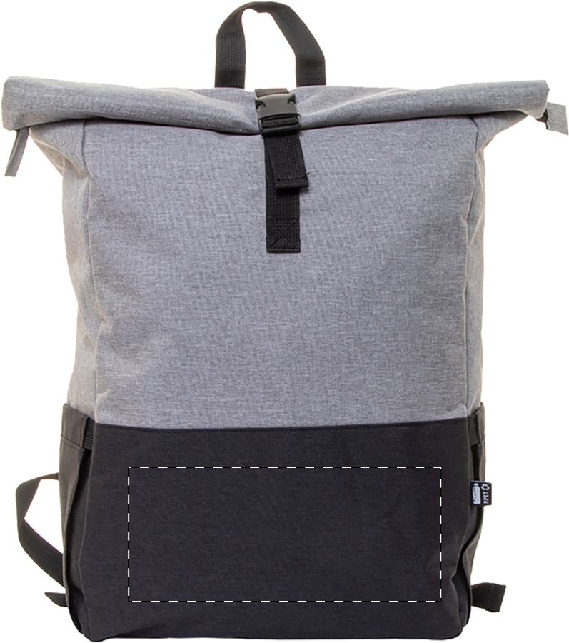 Két tónusú, RPET hátizsák csatos záródással, cipzáras fő rekesszel, párnázott laptop (15") és tablet (10") rekesszel, oldalzsebekkel, párnázott hát- és vállpánttal. 300D RPET poliészter, megkülönböztető RPET címkével.