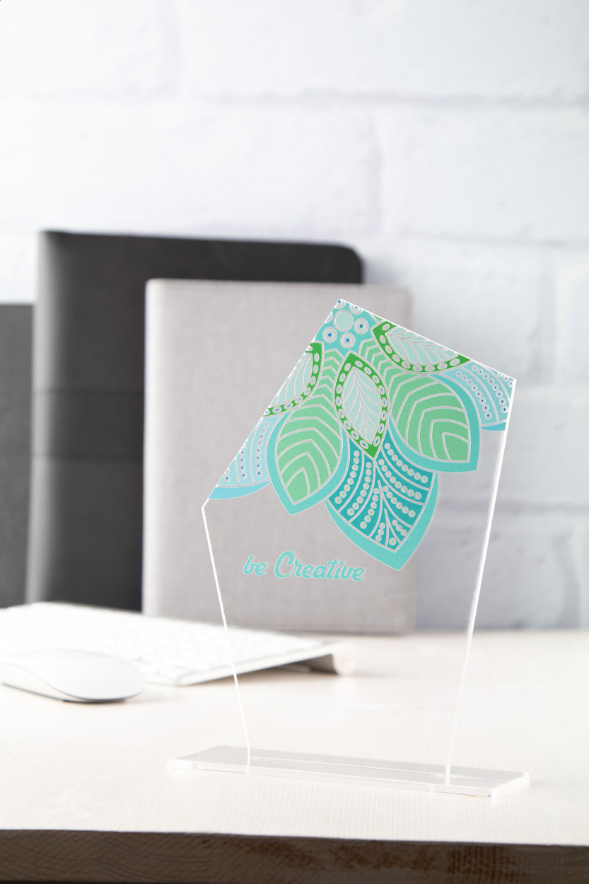 Egyedi gyártású akril trófea, egyedi formával és full colour emblémázással. Az ár tartalmazza az UV nyomtatás költségét. Minimális rendelési mennyiség: 50 db. Lapraszerelten szállítjuk.