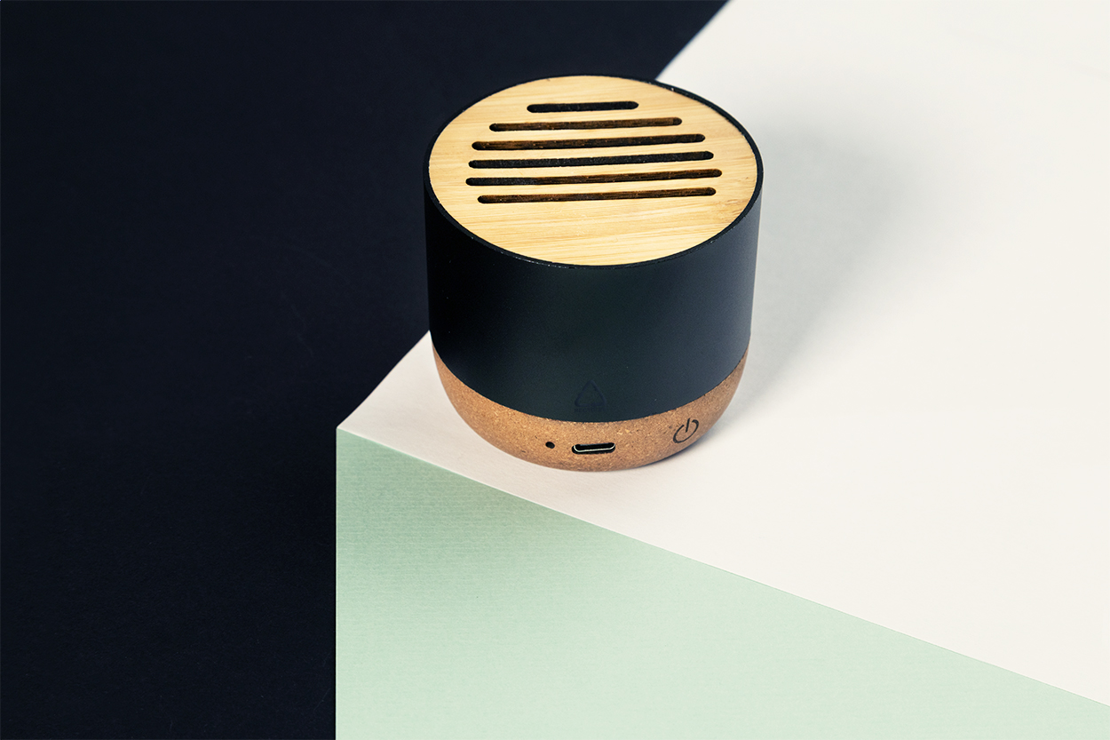 Vezeték nélküli hangszóró újrahasznosított alumínium házban, bambuszhálóval és természetes parafa talppal. Újratölthető akkumulátorral (400 mAh). USB töltőkábellel.