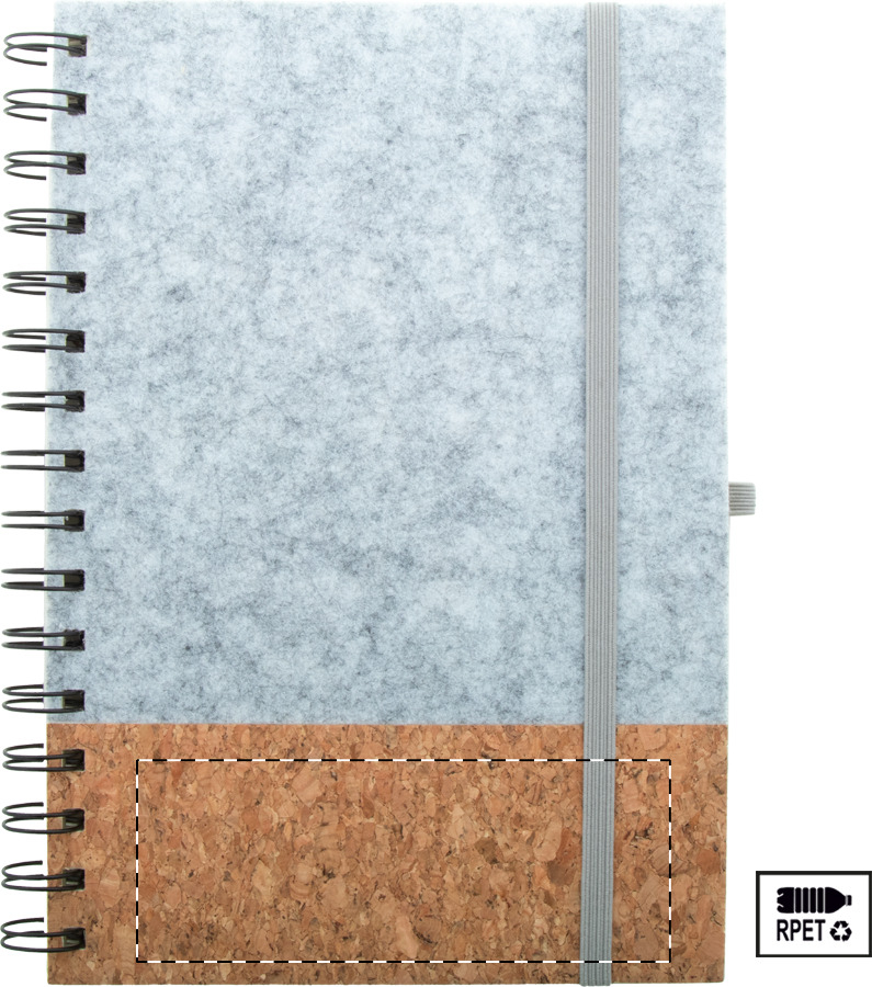 RPET filc és természetes parafa borítású jegyzetfüzet újrahasznosított papírból készült 70 vonalas lappal, gumipánttal és tolltartóval. A5 méretű.