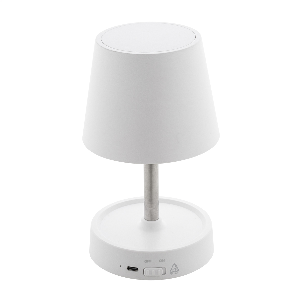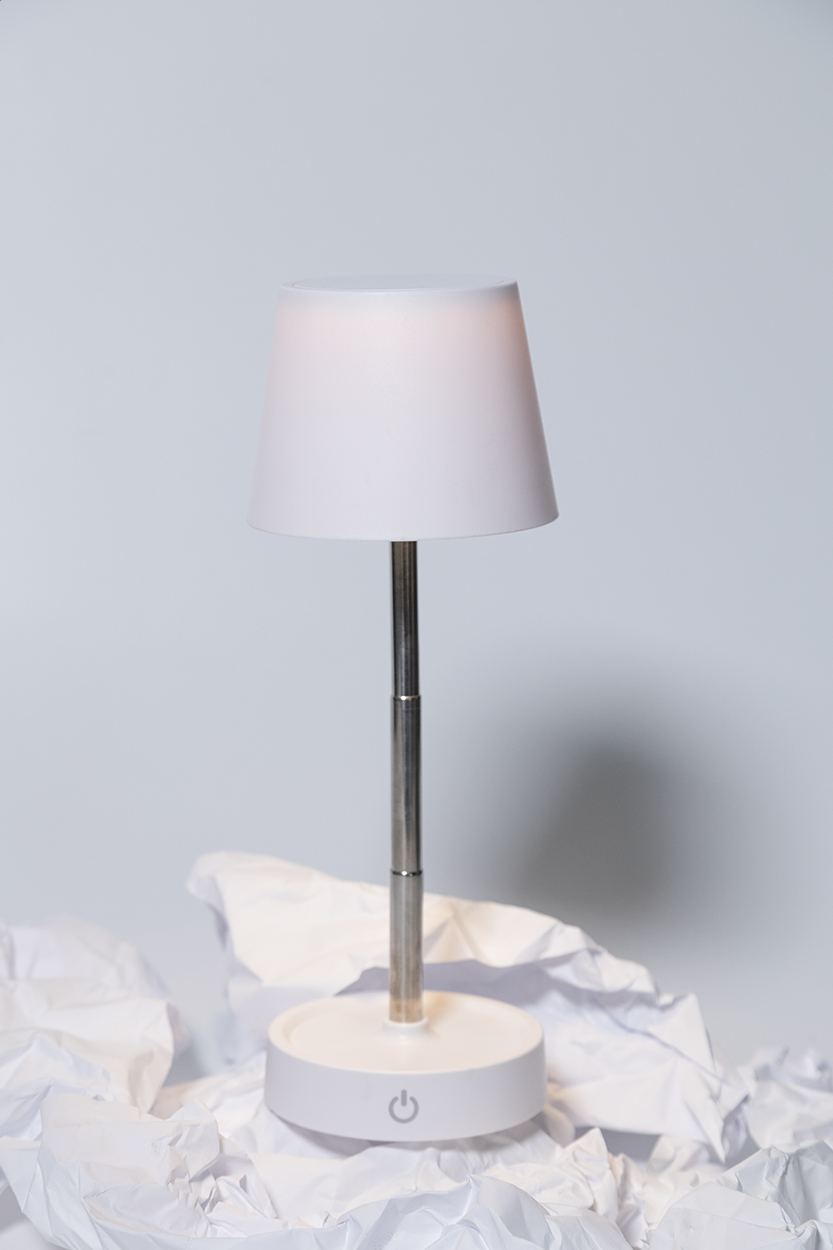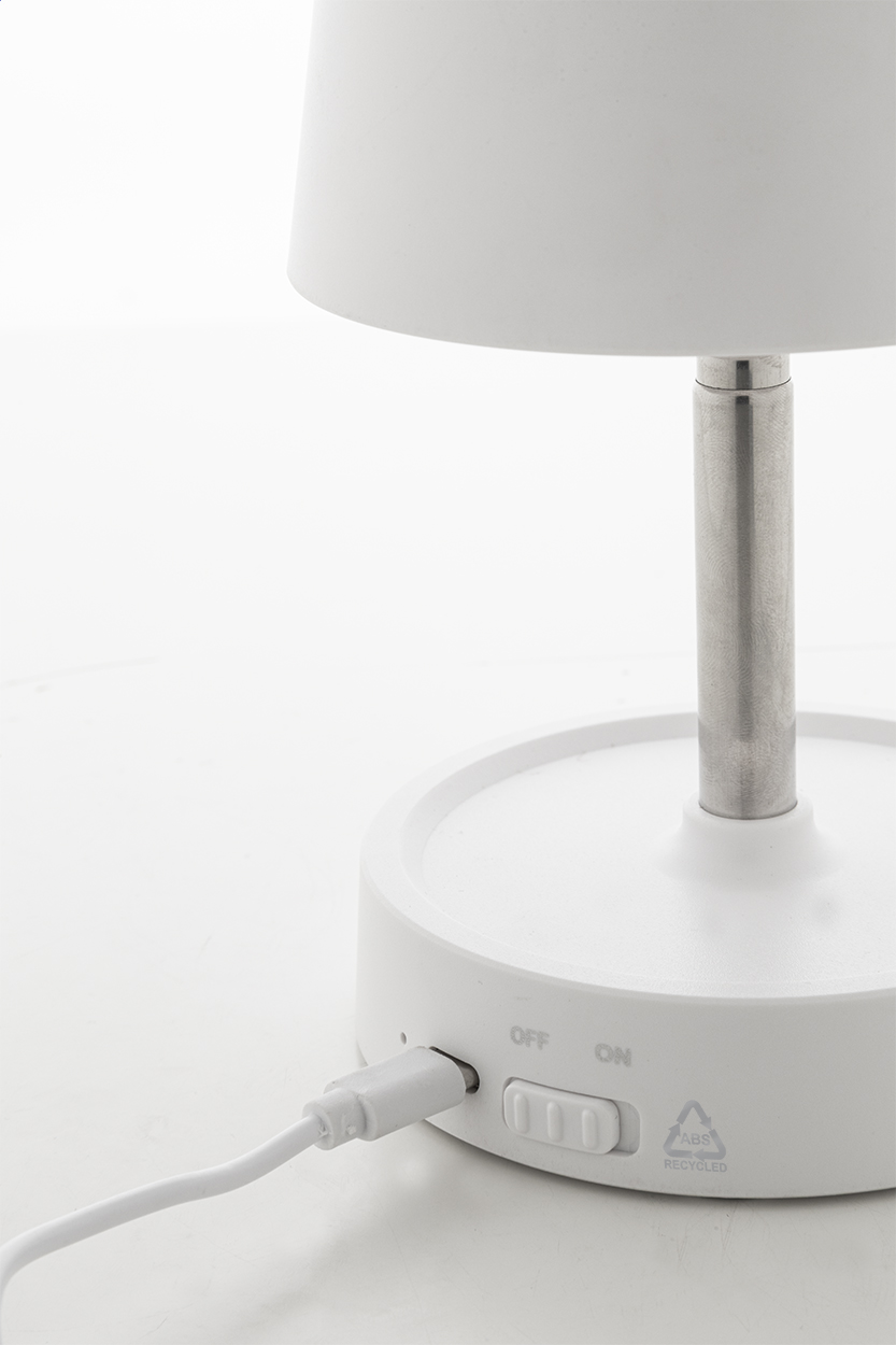 Teleszkópos asztali lámpa újrahasznosított ABS műanyagból, 12 LED-del, állítható fényerővel és 1200 mAh-s USB újratölthető akkumulátorral. USB töltőkábellel.
