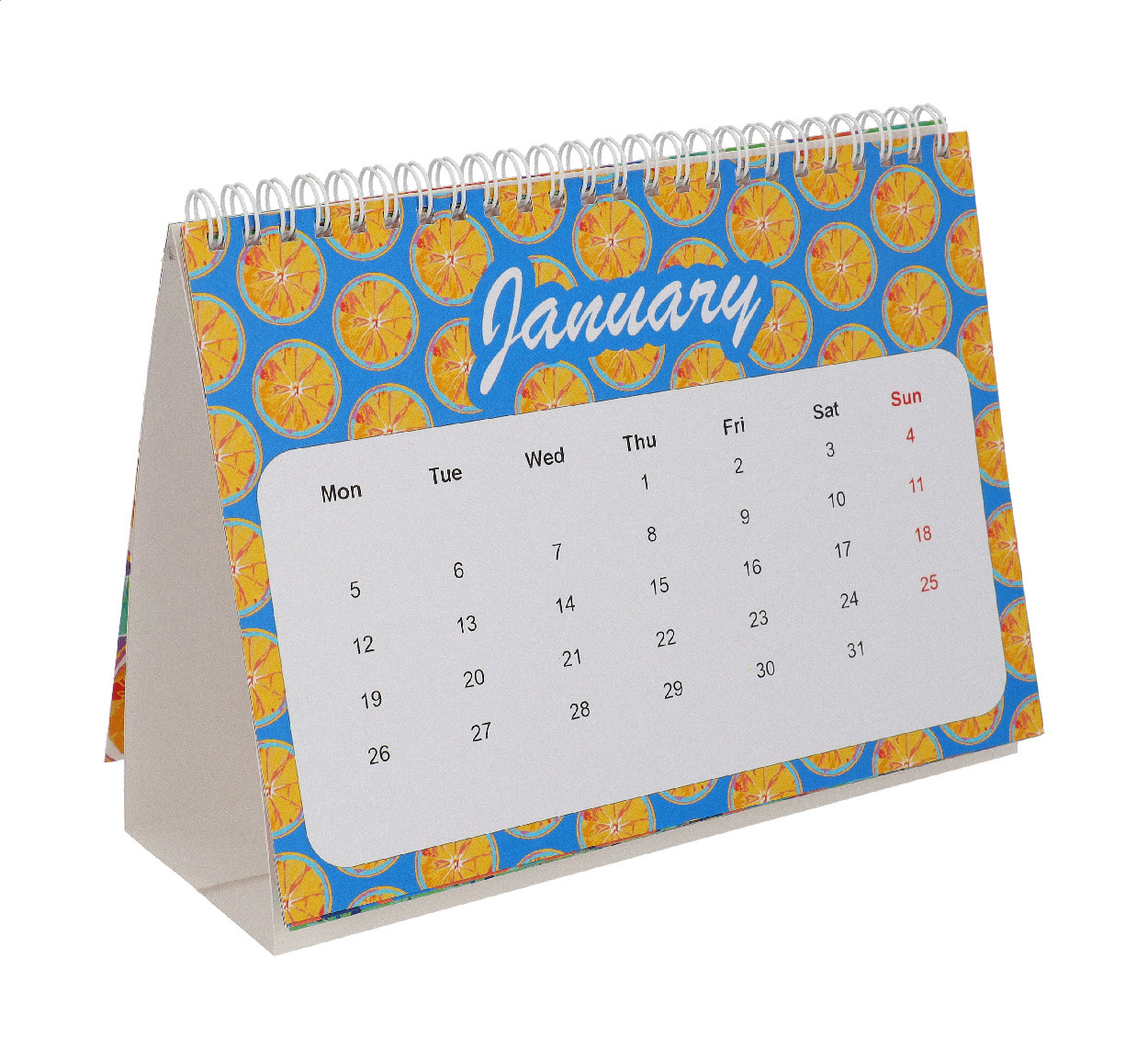 Egyedi gyártású, spirál asztali naptár full-colour grafikákkal. 6 kétoldalú havi lappal és egy borítóval. Az ár tartalmazza az összes oldal digitális nyomtatását. Minimális rendelési mennyiség: 100 db.