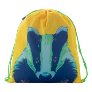Egyedi gyártású gyerek hátizsák színes, zsinórfüles vállpánttal, 190T RPET poliészter. Teljes felületén szublimációs eljárással emblémázva és megkülönböztető RPET címkével. Minimális rendelési mennyiség: 25 db.
