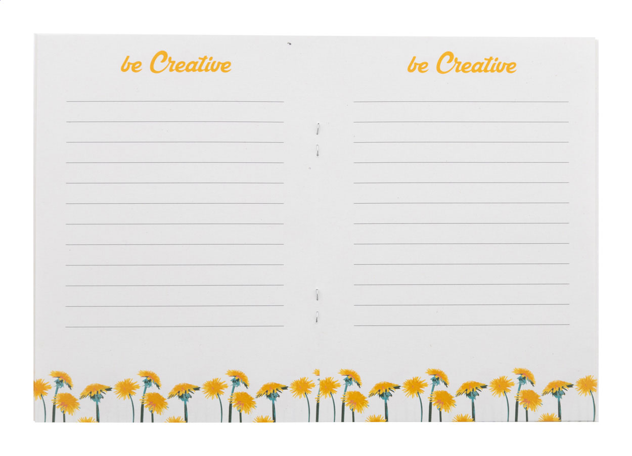 Egyedi gyártású, magpapírral borított jegyzetfüzet 32 újrahasznosított papírlappal, A6 méretű. Az ár tartalmazza a full-colour nyomtatott külső borítót és a belső oldalak azonos full-colour nyomtatását. Minimális rendelési mennyiség: 100 db. Válogatott vadvirág magvakkal.