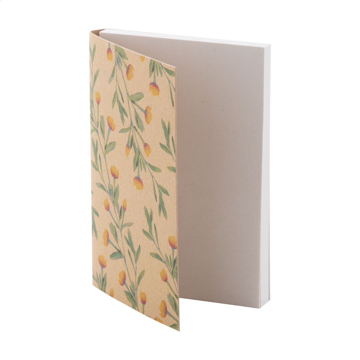 Egyediesíthető, újrahasznosított kraft papírral borított öntapadós jegyzettömb. Tartalmaz 50 újrahasznosított papír öntapadós jegyzetlapot (50×75 mm). Az ár tartalmazza a külső borító full-colour nyomtatását. Minimális rendelési mennyiség: 100 db.