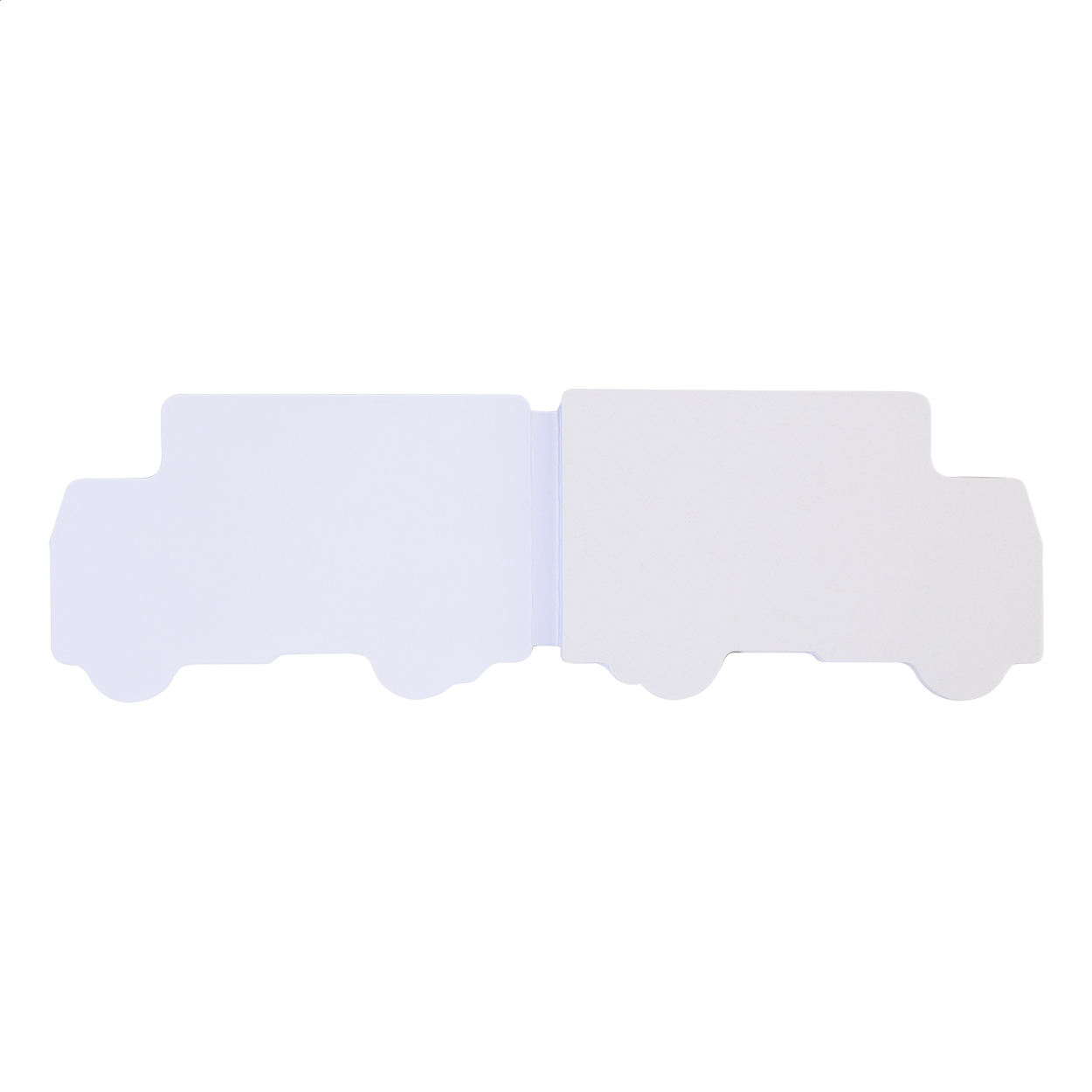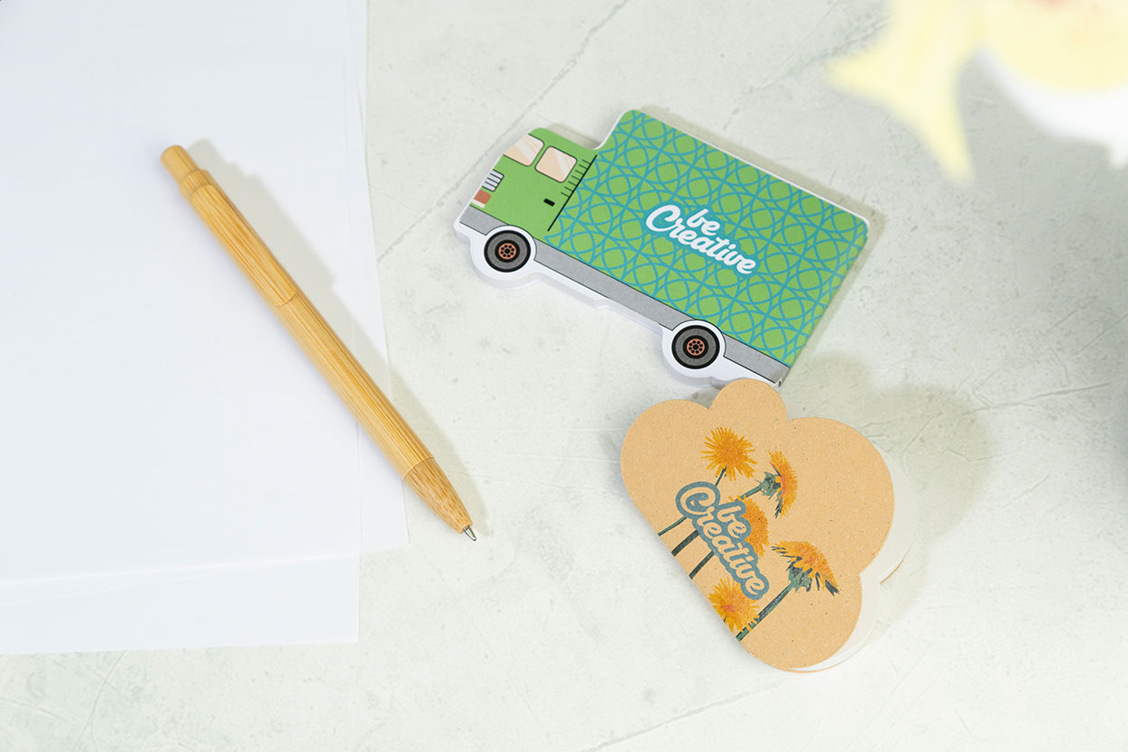Egyedi gyártású, teherautó alakú öntapadós jegyzettömb papír borítással. 50 újrahasznosított papírból készült öntapadós jegyzetlapot tartalmaz. Az ár tartalmazza a full-colour nyomtatott külső borítót. Minimális rendelési mennyiség: 100 db.