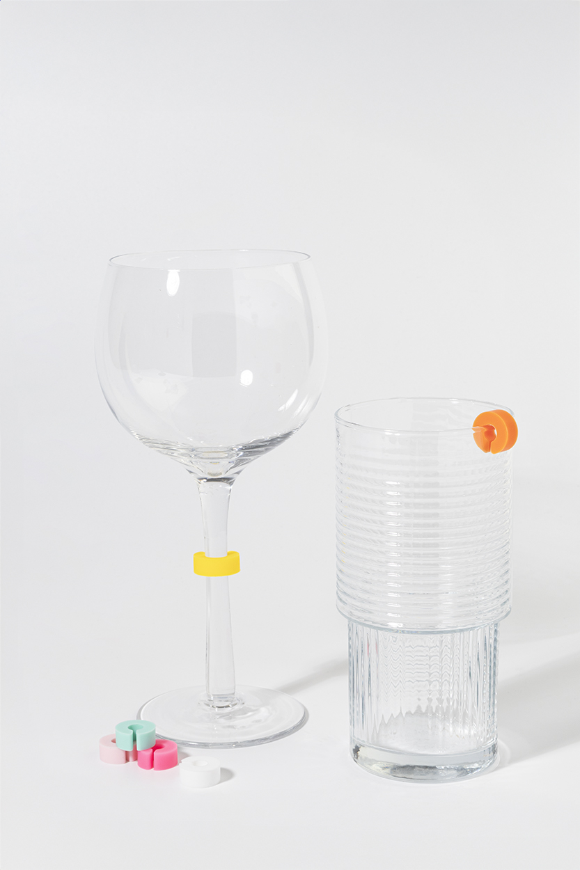 12 darabos színes, szilikon anyagú pohárjelölő szett újrahasznosított PP tárolódobozban.