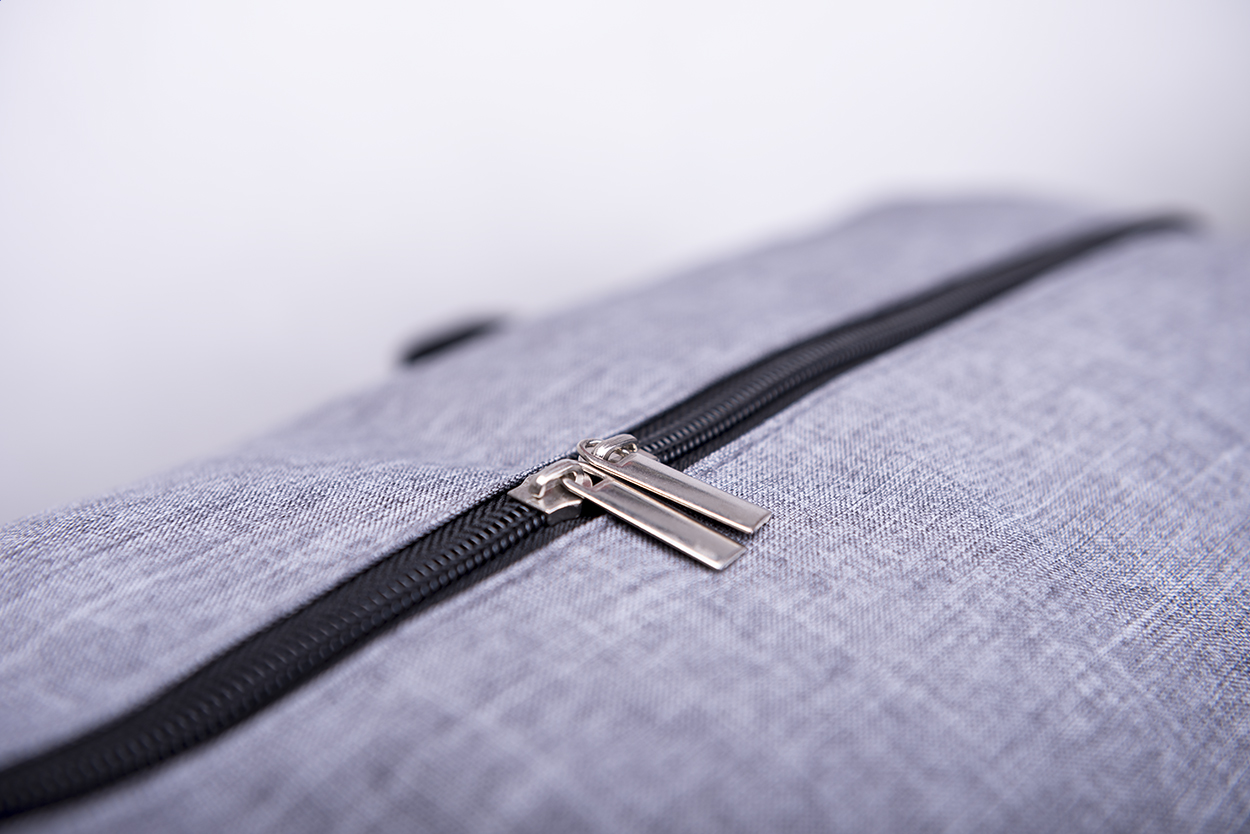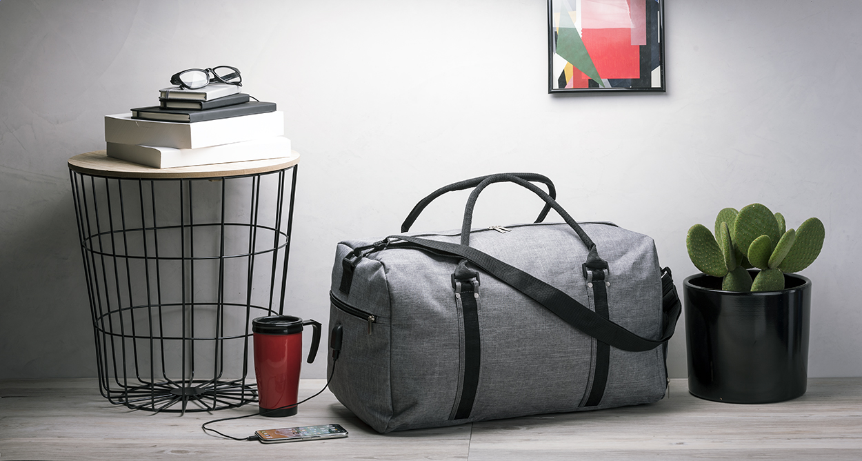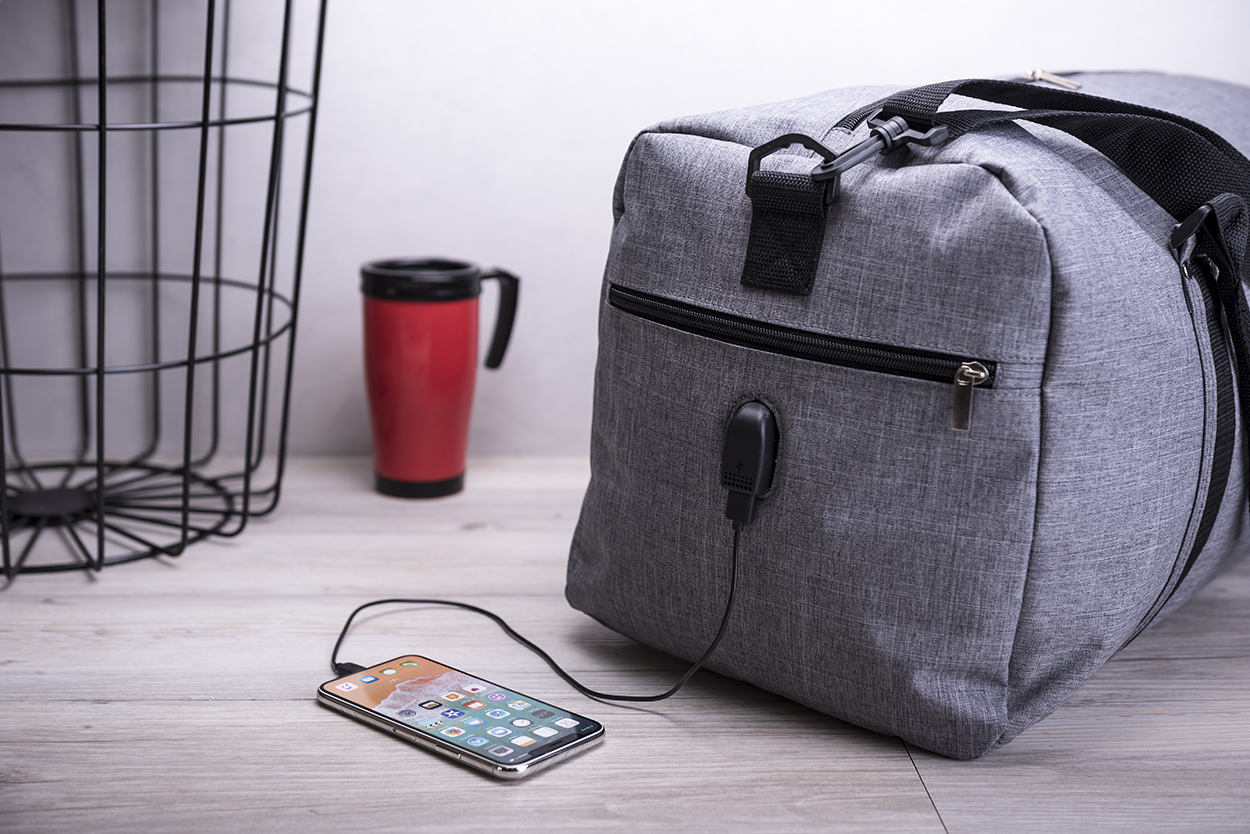Sporttáska cipzáras zsebbel, vállpánttal és beépített USB csatlakozóval power bankhoz. 600D poliészter.