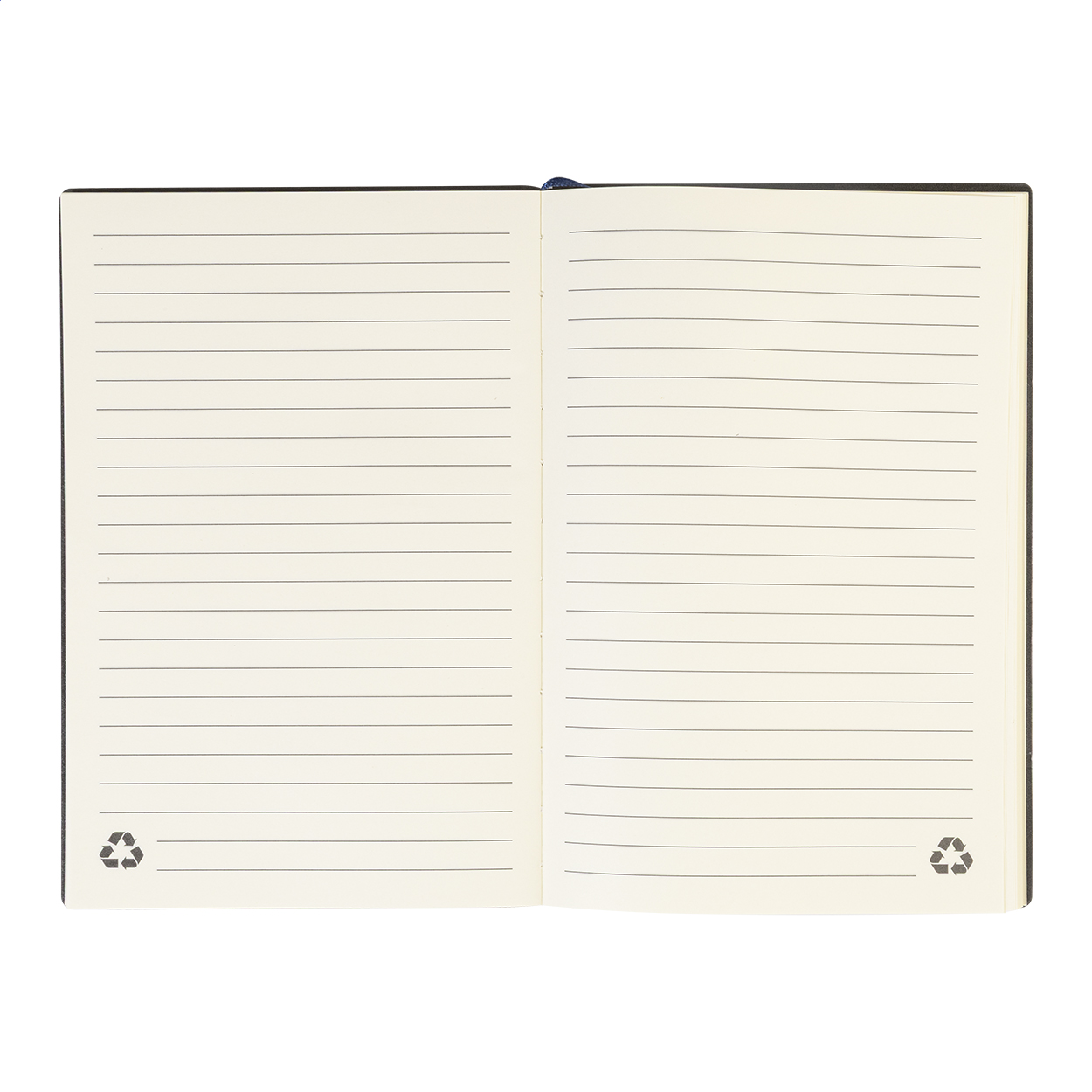 Újrahasznosított műbőr borítású jegyzetfüzet csíkos díszítéssel és fém logózható résszel. Könyvjelzővel és 80 vonalas lappal újrahasznosított papírból. A5-ös méret.