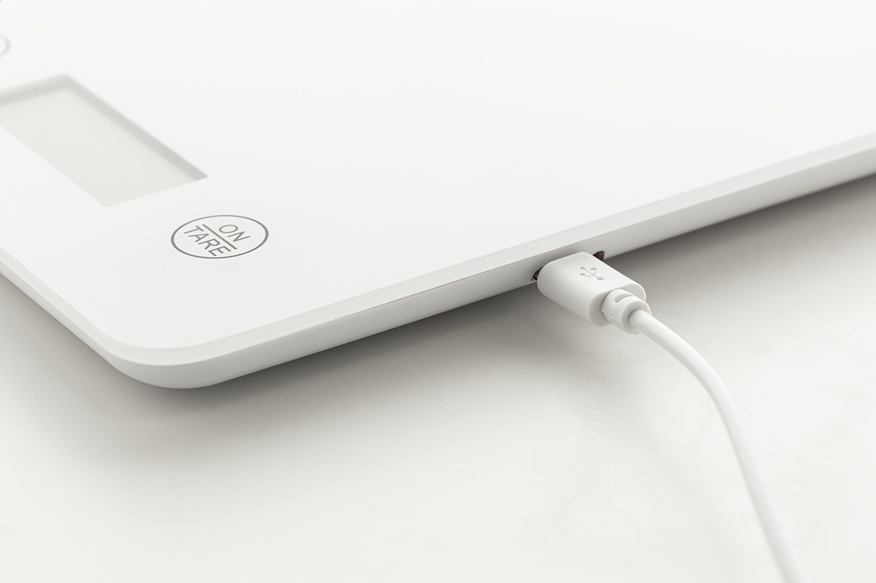 Digitális konyhai mérleg edzett üveg mérőfelülettel és beépített USB újratölthető akkumulátorral (200 mAh). Méréshatár 5 kg-ig. Mérési pontosság: 1 g. Választható mérési egységek: kg/g/oz. Tej és víz mérési funkcióval (ml). USB töltőkábellel.