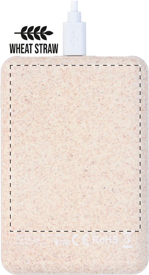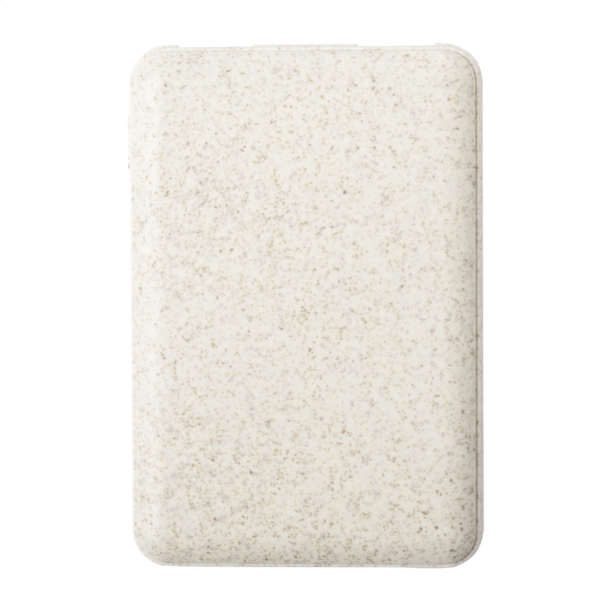 Power bank környezetbarát búzaszalma műanyagból 5000 mAh akkumulátorral és 2 USB kimenettel. Micro USB töltőkábellel szállítjuk.