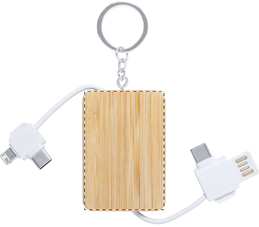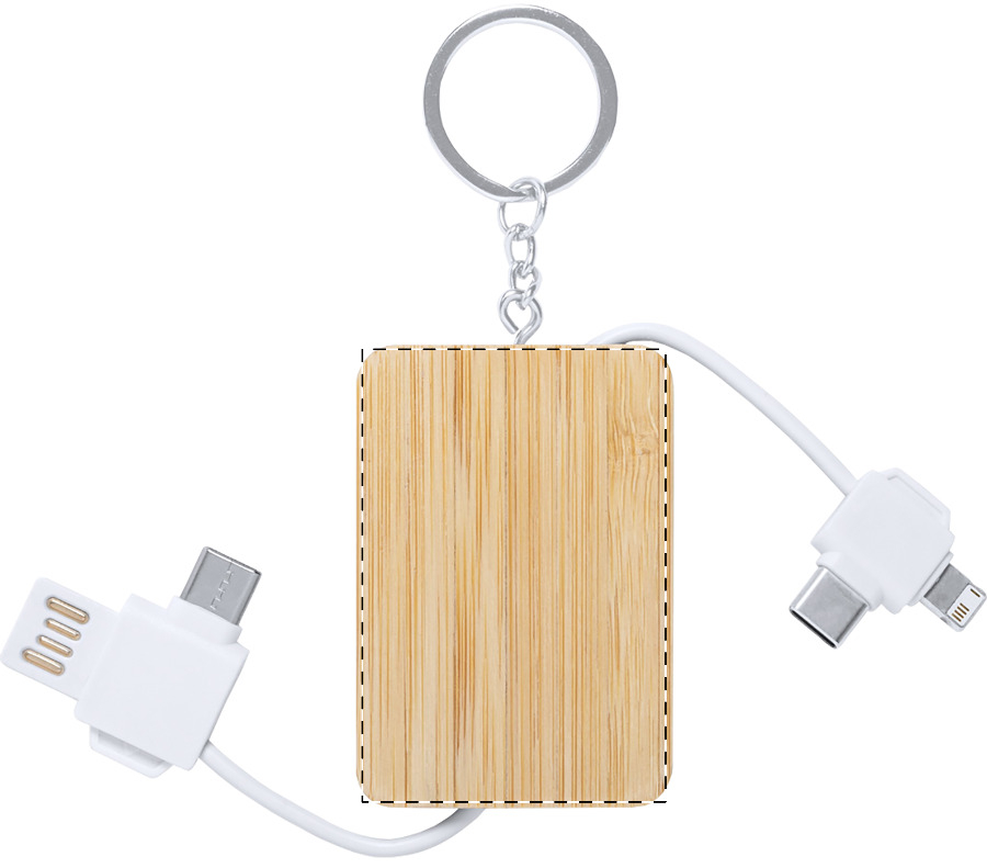 Bambusz kulcstartó és USB töltőkábel, micro USB, USB-C és Lightning csatlakozókkal. USB és USB-C bemenettel.