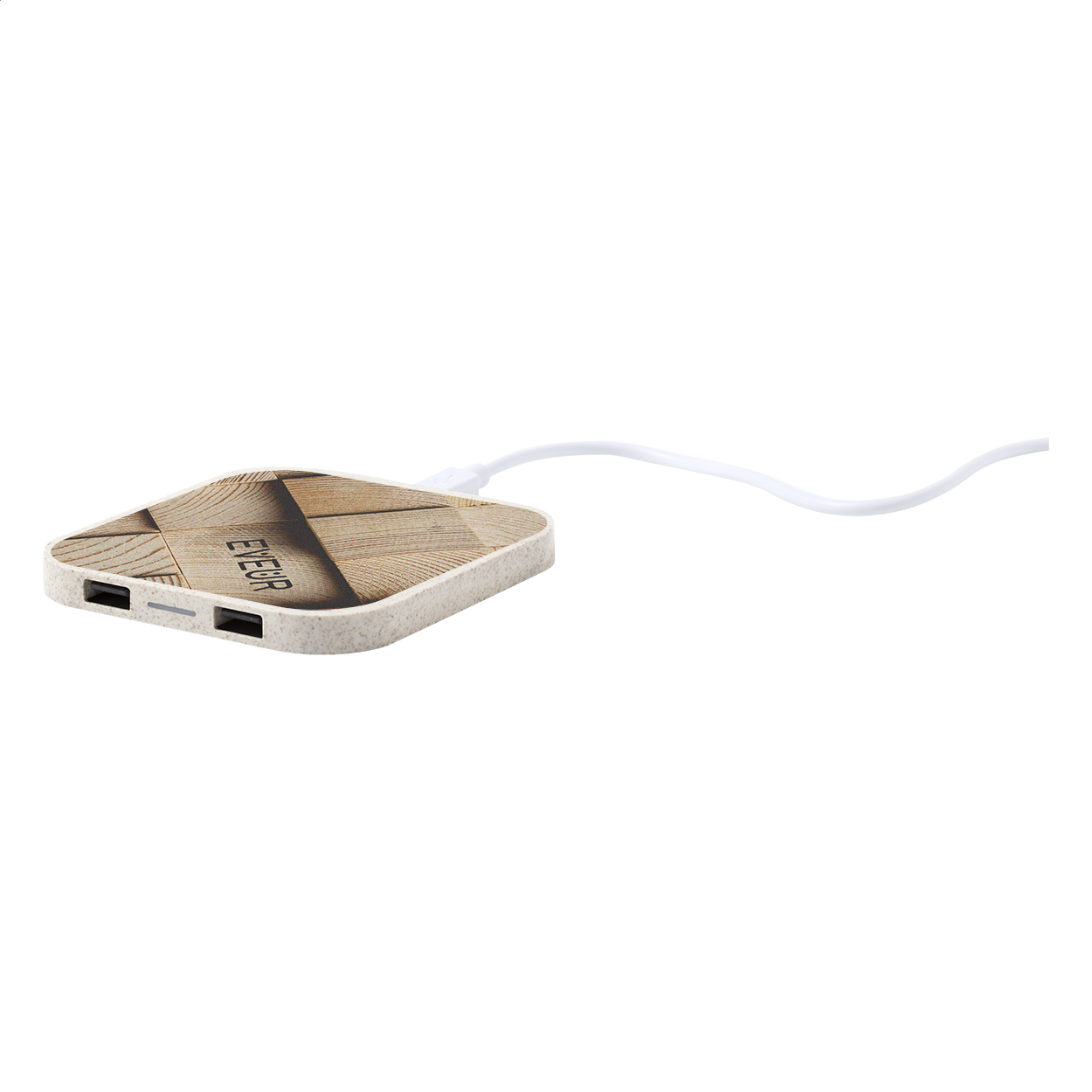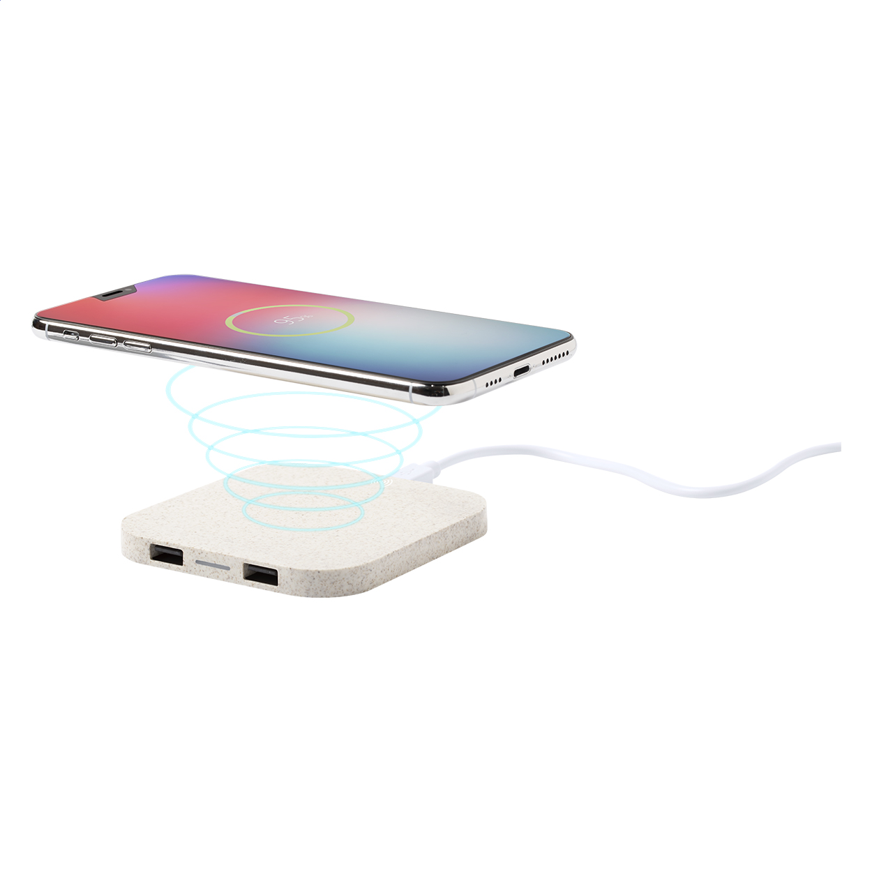 Vezeték nélküli mobiltelefon-töltő (10W) környezetbarát búzaszalma műanyagból, 2 USB porttal. Max. kimenet: 2100 mA. USB kábellel szállítjuk.