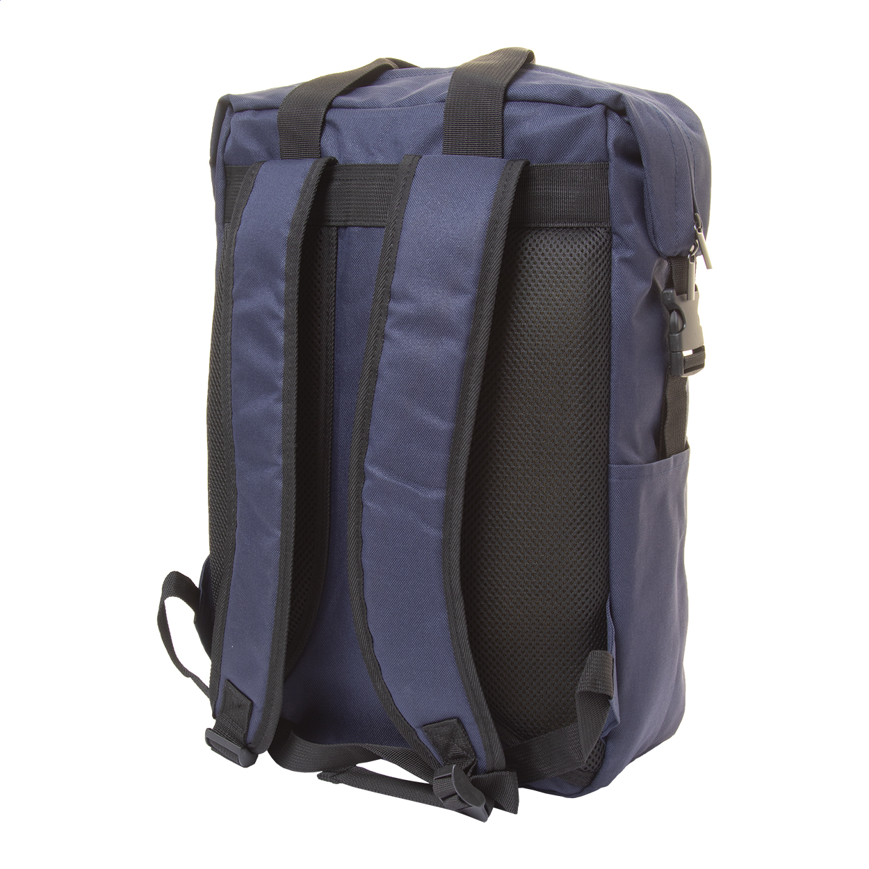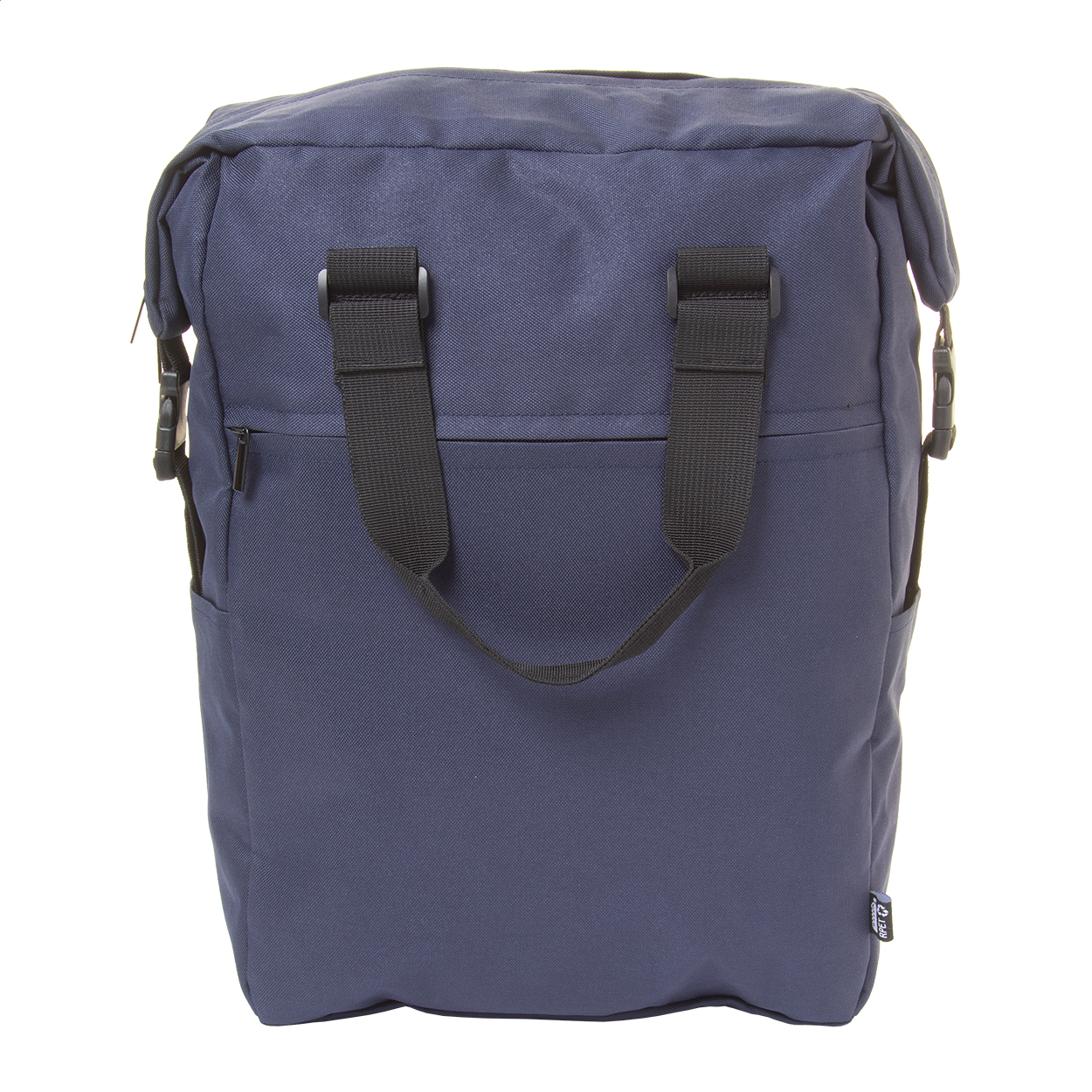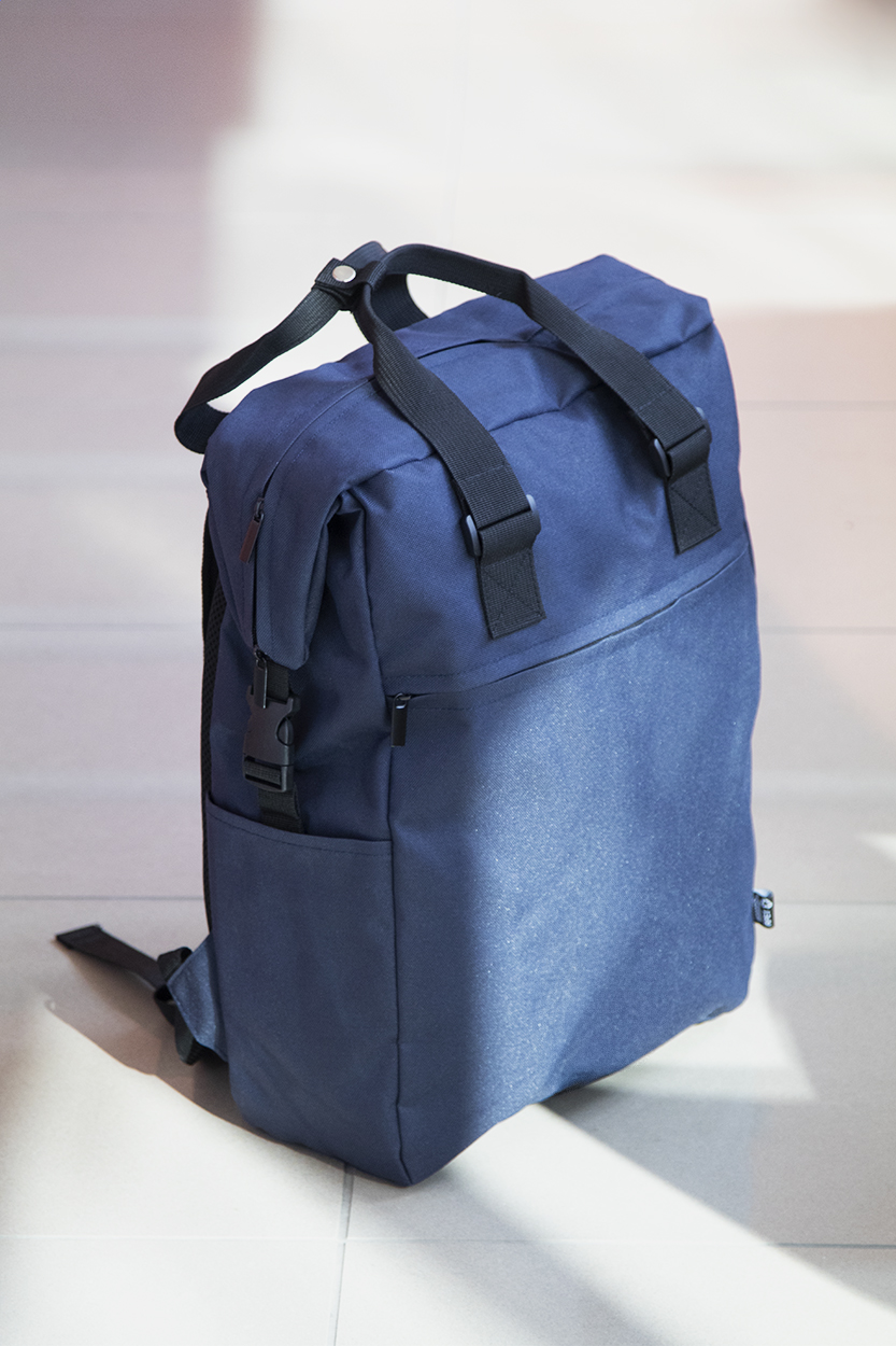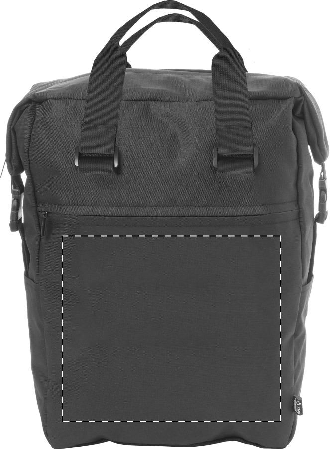 RPET hátizsák cipzáras fő rekesszel és első zsebbel, párnázott laptop (15") és tablet (10") rekesszel, oldalsó csatos pántokkal és zsebekkel, párnázott hát- és vállpántokkal. 600D RPET poliészter, megkülönböztető RPET címkével.