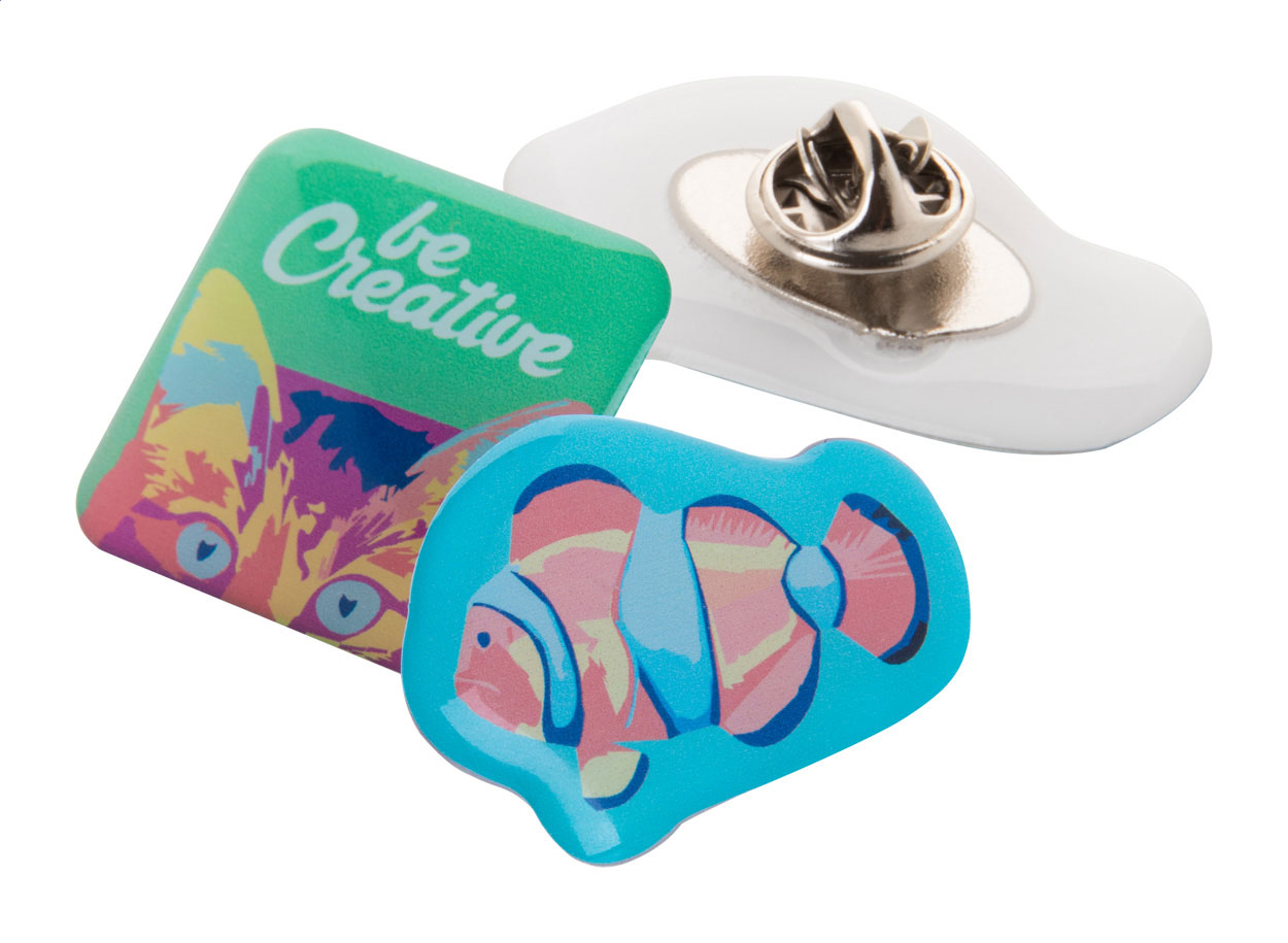 Egyedi grafikájú és formájú epoxy matricás kitűző. Maximális méret: 9 cm². Minimum rendelési mennyiség: 100 db.