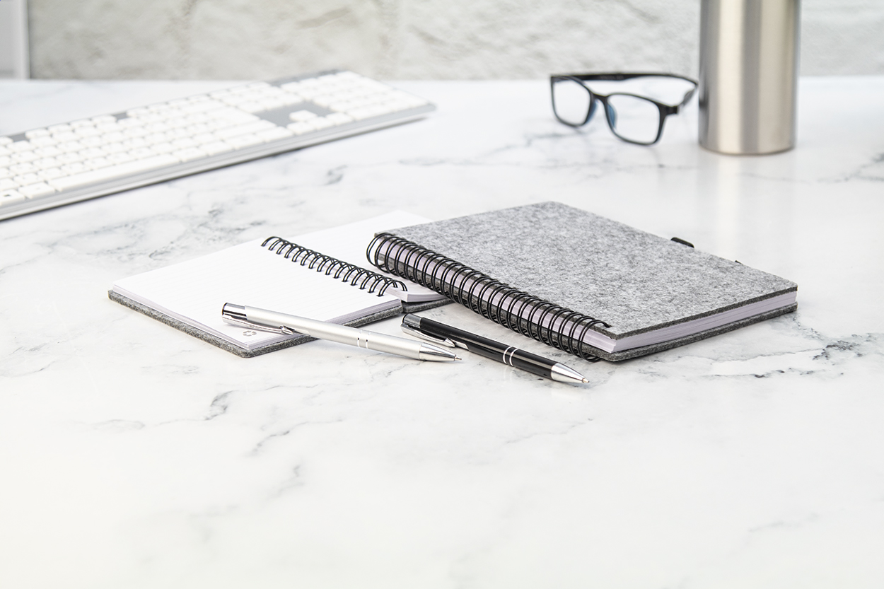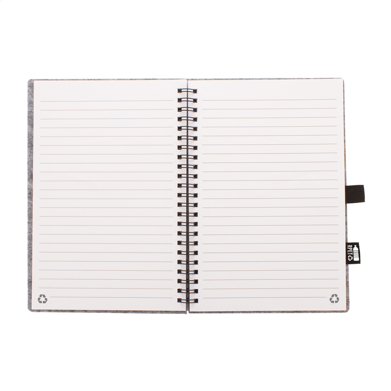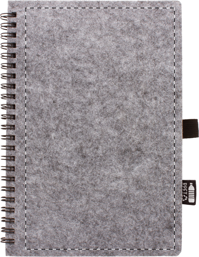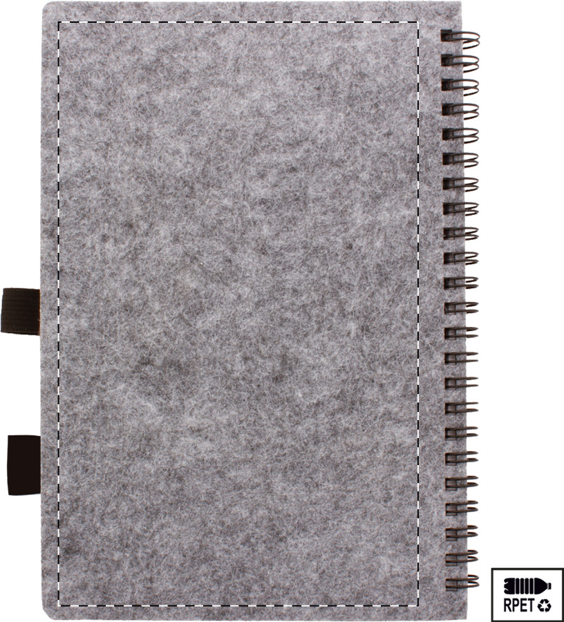 RPET filc borítású spirál jegyzetfüzet, megkülönböztető RPET címkével és 80, újrahasznosított papírból készült vonalas lappal. A5 méretű.