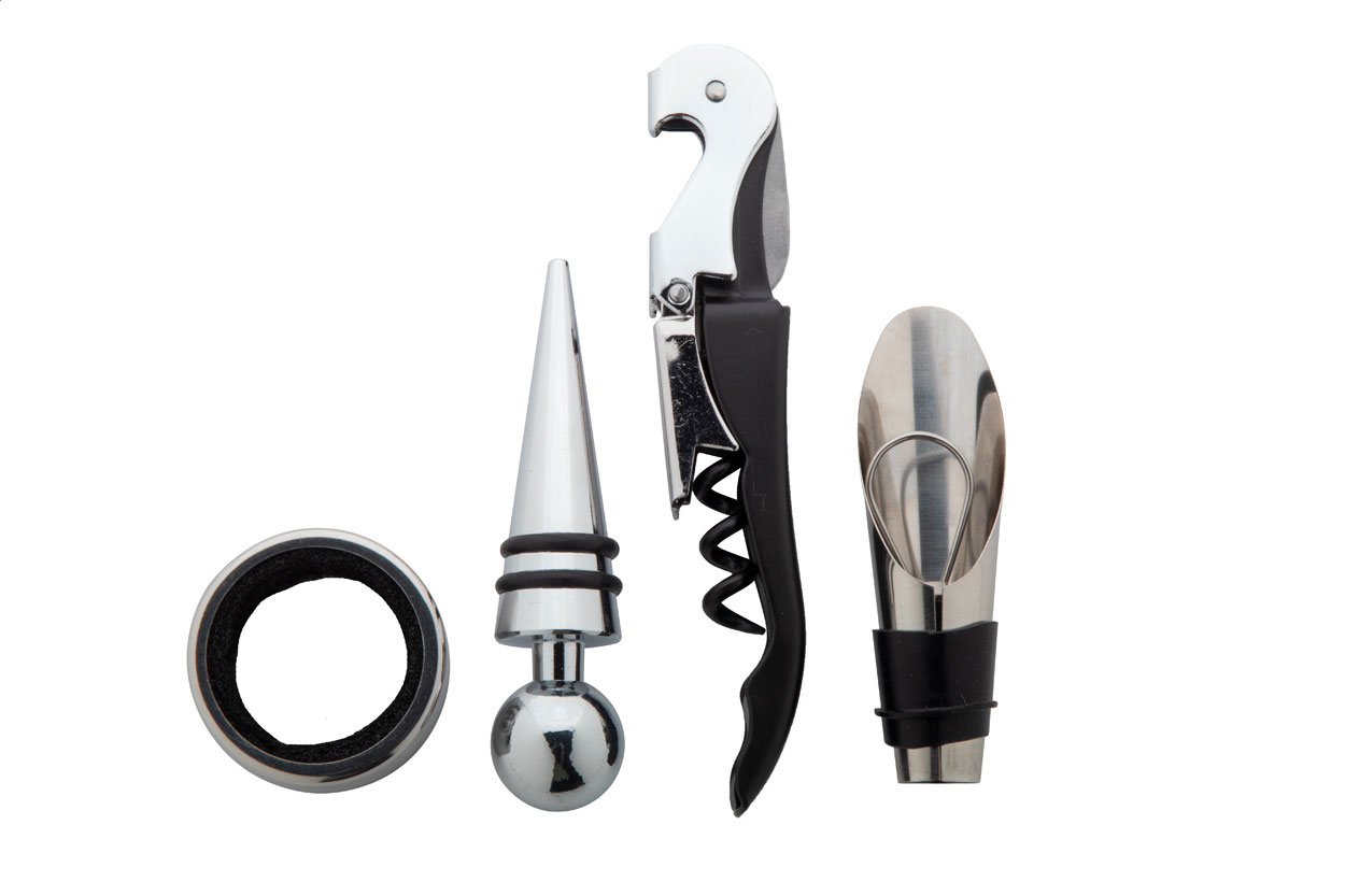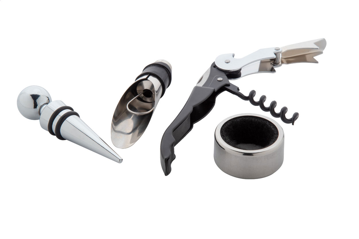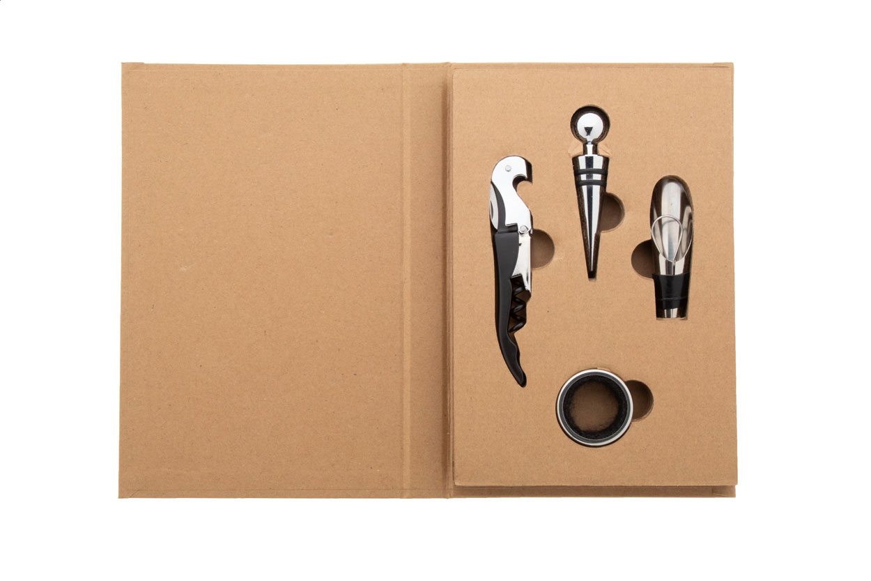 4 db-os rozsdamentes acél boros szett, újrahasznosított kraft papírból készült, könyv formájú dobozban. Dugóhúzóval, cseppőrrel, kiöntővel és záródugóval.