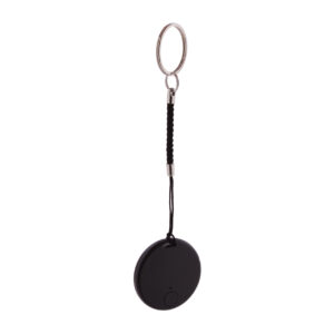 Kulcskereső eszköz vezeték nélküli kapcsolattal, kamera exponáló funkcióval, kör alakú műanyag borításban. Zsinórral és fém karikával. Gombelemmel szállítjuk. Ingyenes iOS / Android applikációval működik.