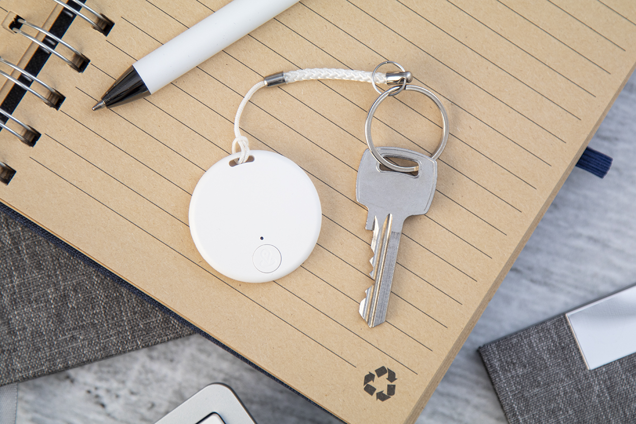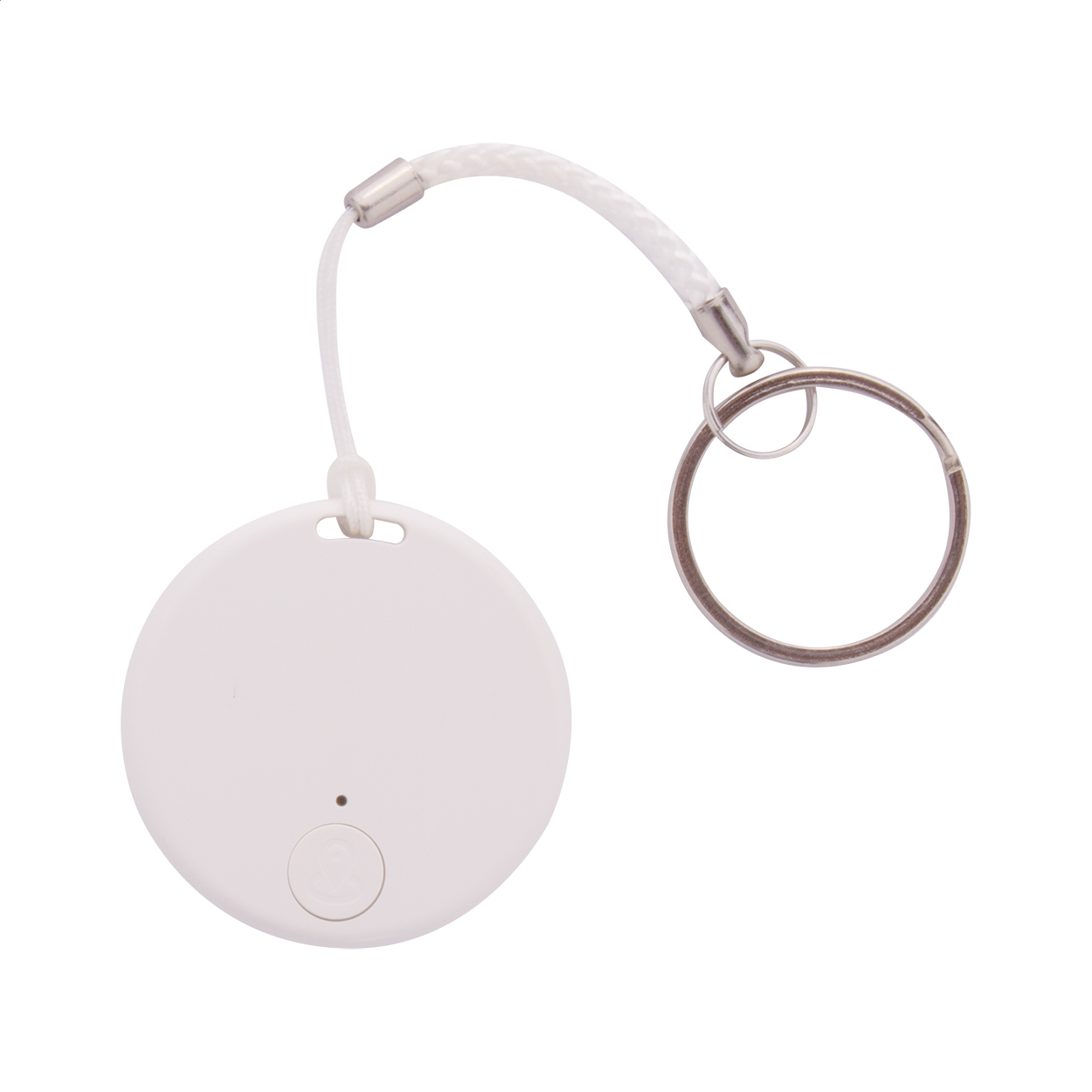 Kulcskereső eszköz vezeték nélküli kapcsolattal, kamera exponáló funkcióval, kör alakú műanyag borításban. Zsinórral és fém karikával. Gombelemmel szállítjuk. Ingyenes iOS / Android applikációval működik.