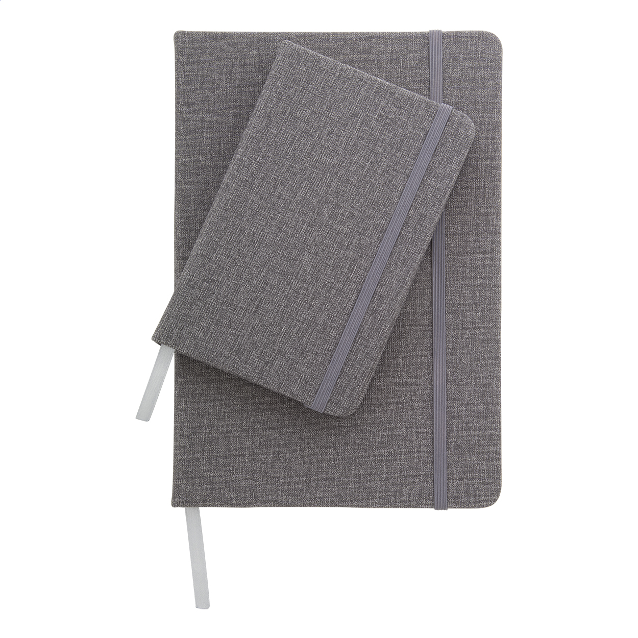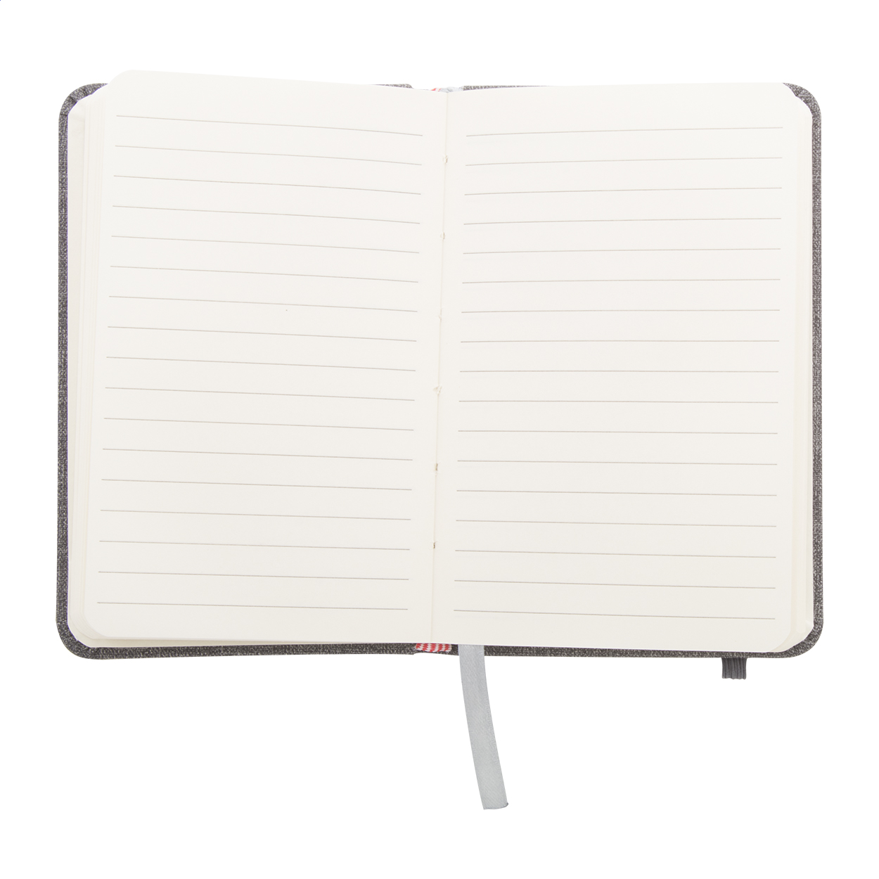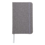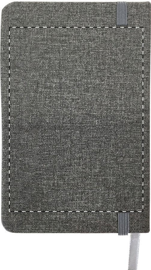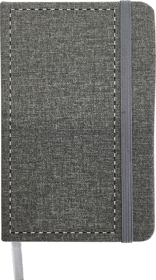 PU bőr borítású textil hatású jegyzetfüzet 80 vonalas lappal, gumipánttal zárható. A6 méretű.