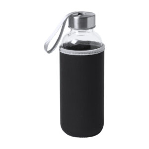 Üveg kulacs hordszíjjal és színes neoprén borítással. 420 ml. Nem alkalmas szénsavas italok tárolására.