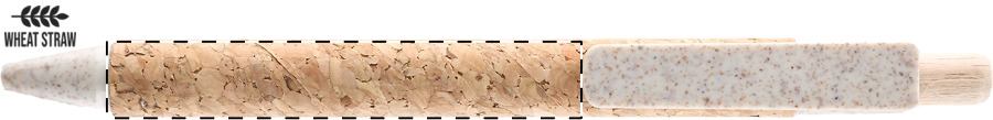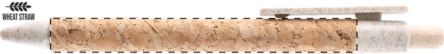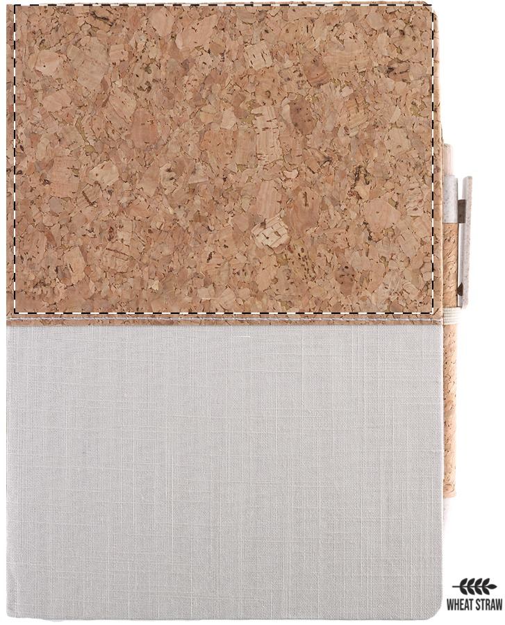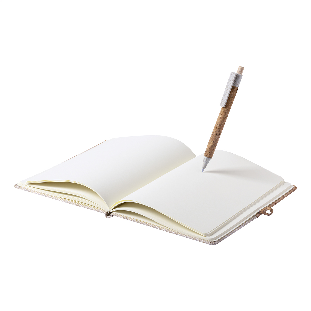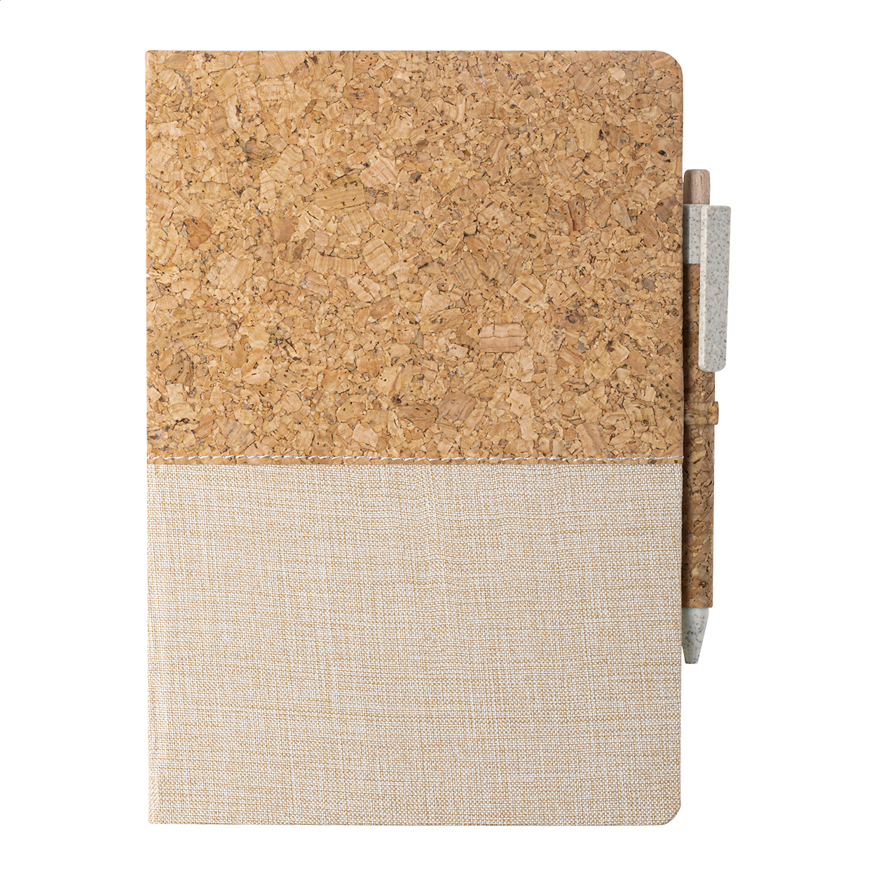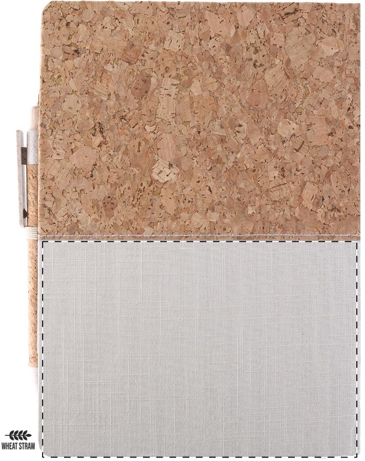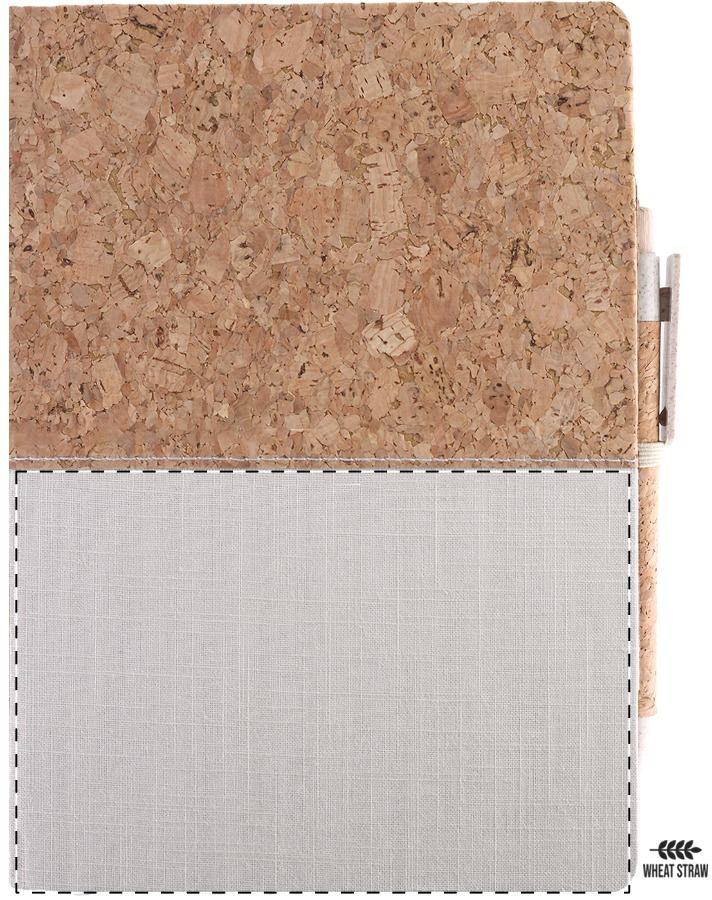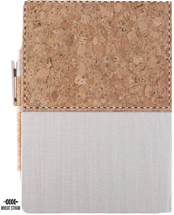 Természetes parafa és pamut bevonatú jegyzetfüzet 80 sima A5 méretű lappal. Tartalmaz egy parafával borított búzaszalma műanyag golyóstollat, fekete tollbetéttel.