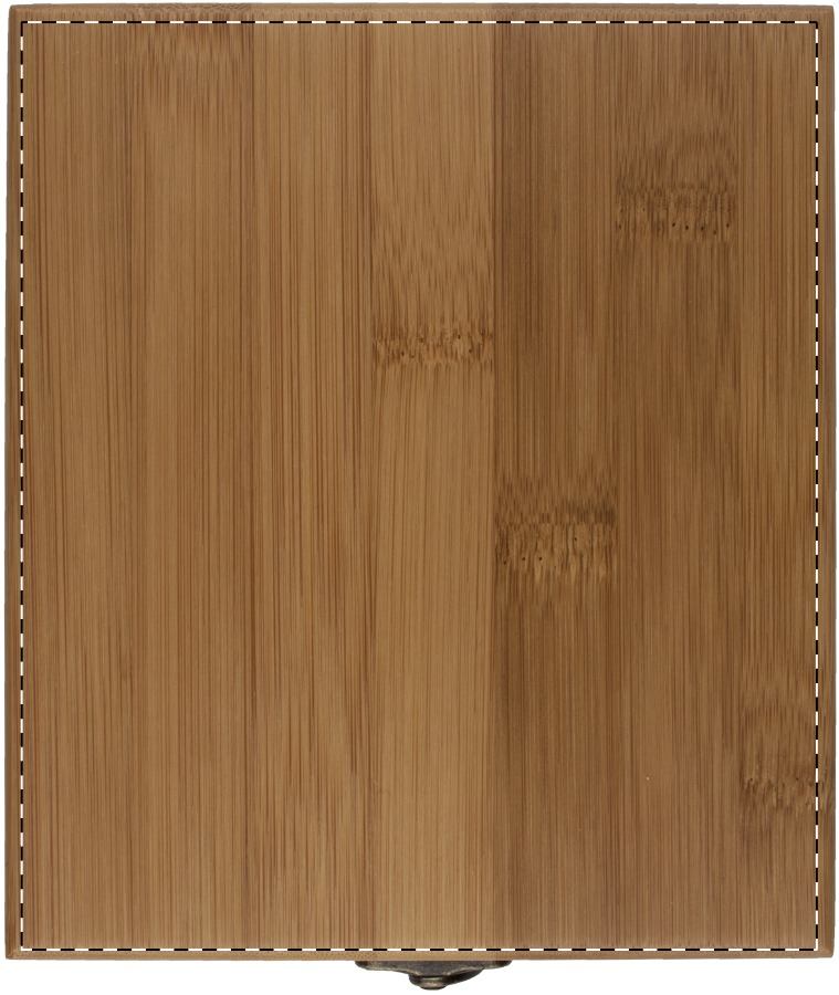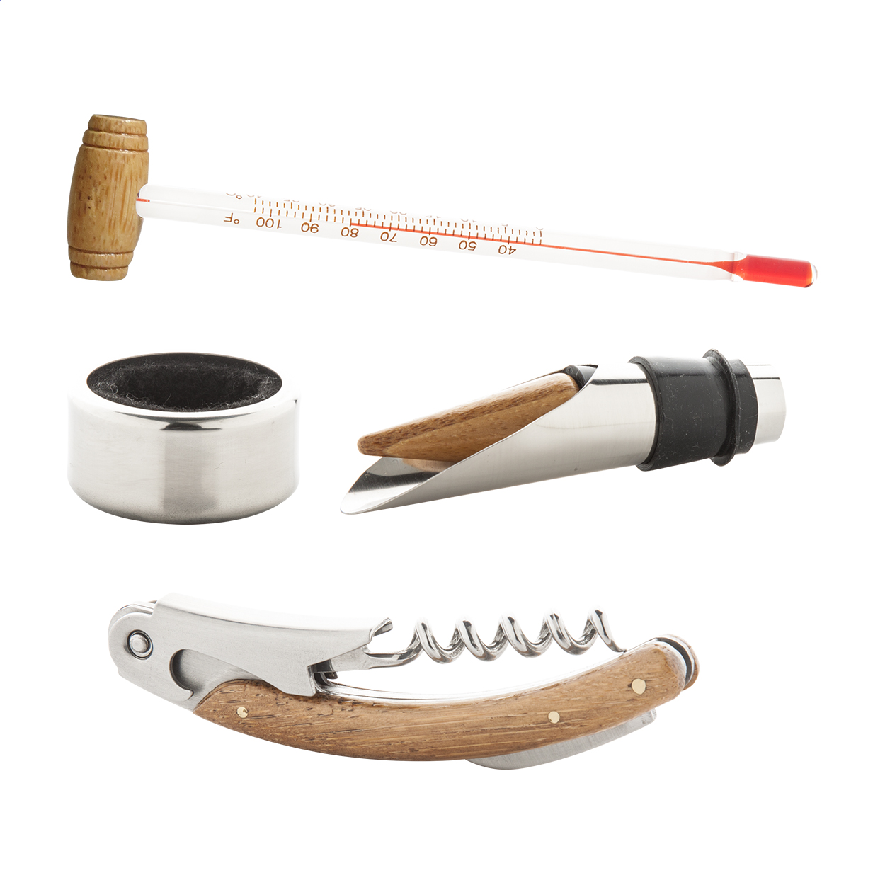 4 részes faberakású boros szett bambusz dobozban, mely bornyitót, cseppőrt, kiöntőt és borhőmérőt tartalmaz.