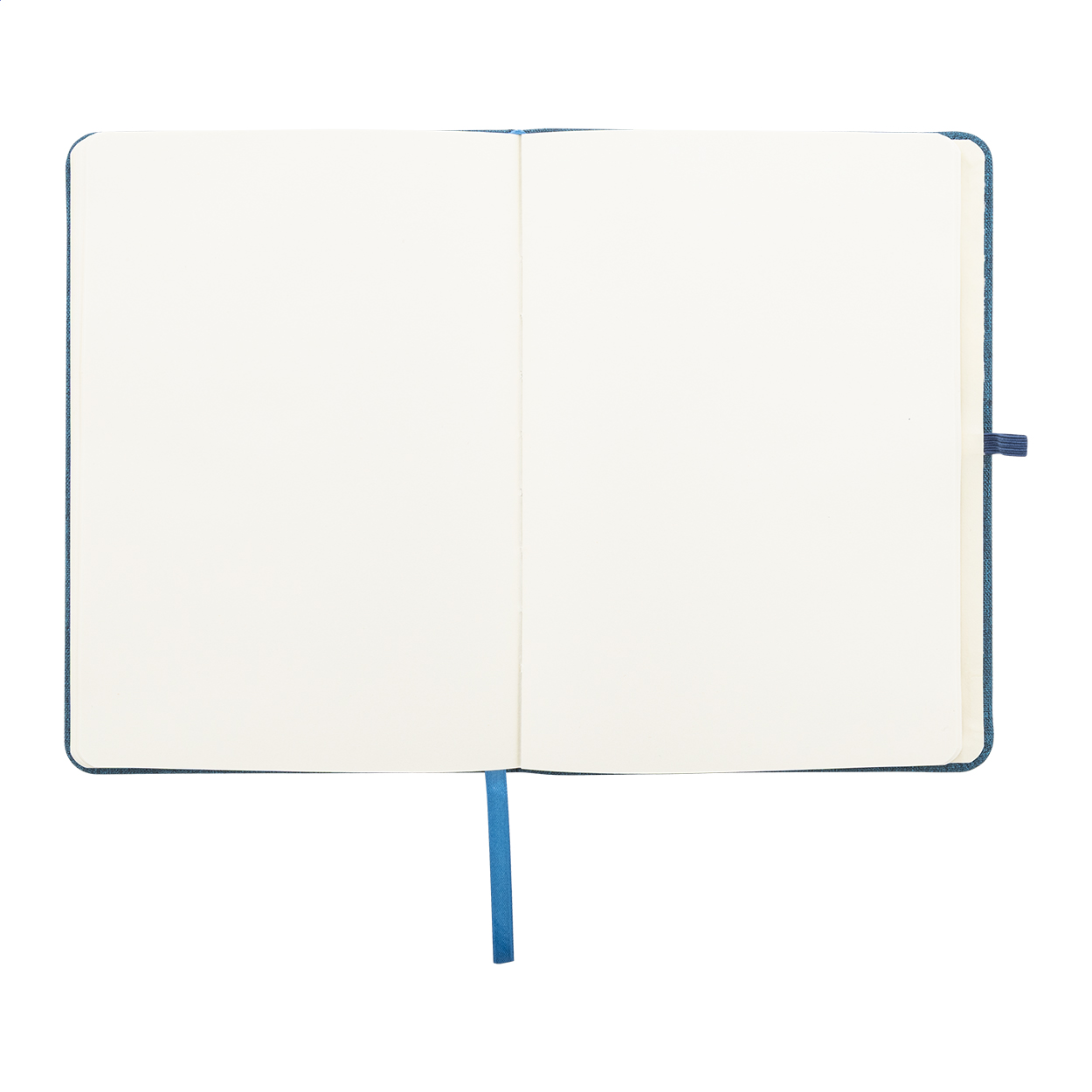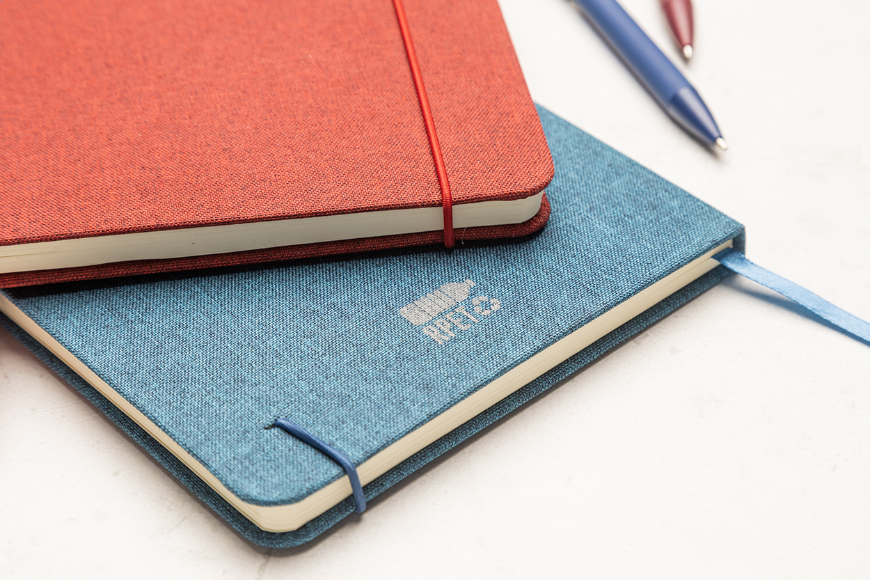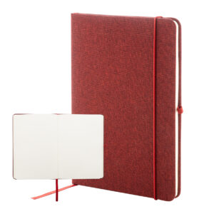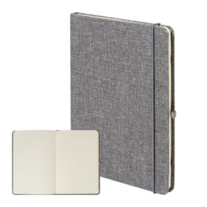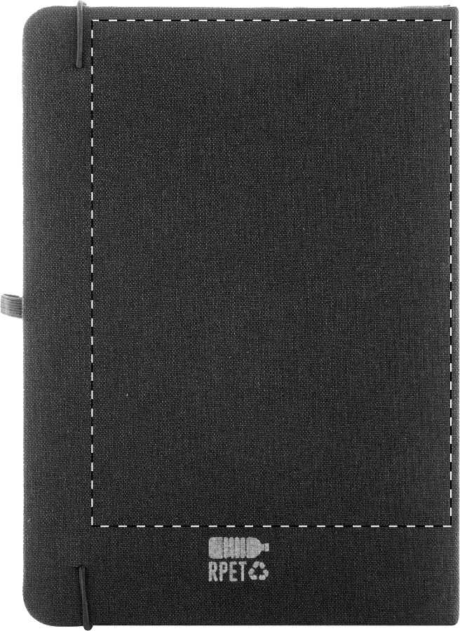 300D RPET poliészter borítású jegyzetfüzet 80 sima lappal. Hozzáillő színű gumipánttal, könyvjelzővel és tolltartóval. A5 méretű.