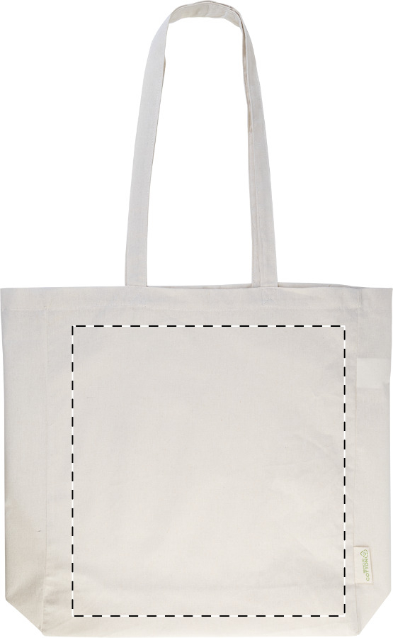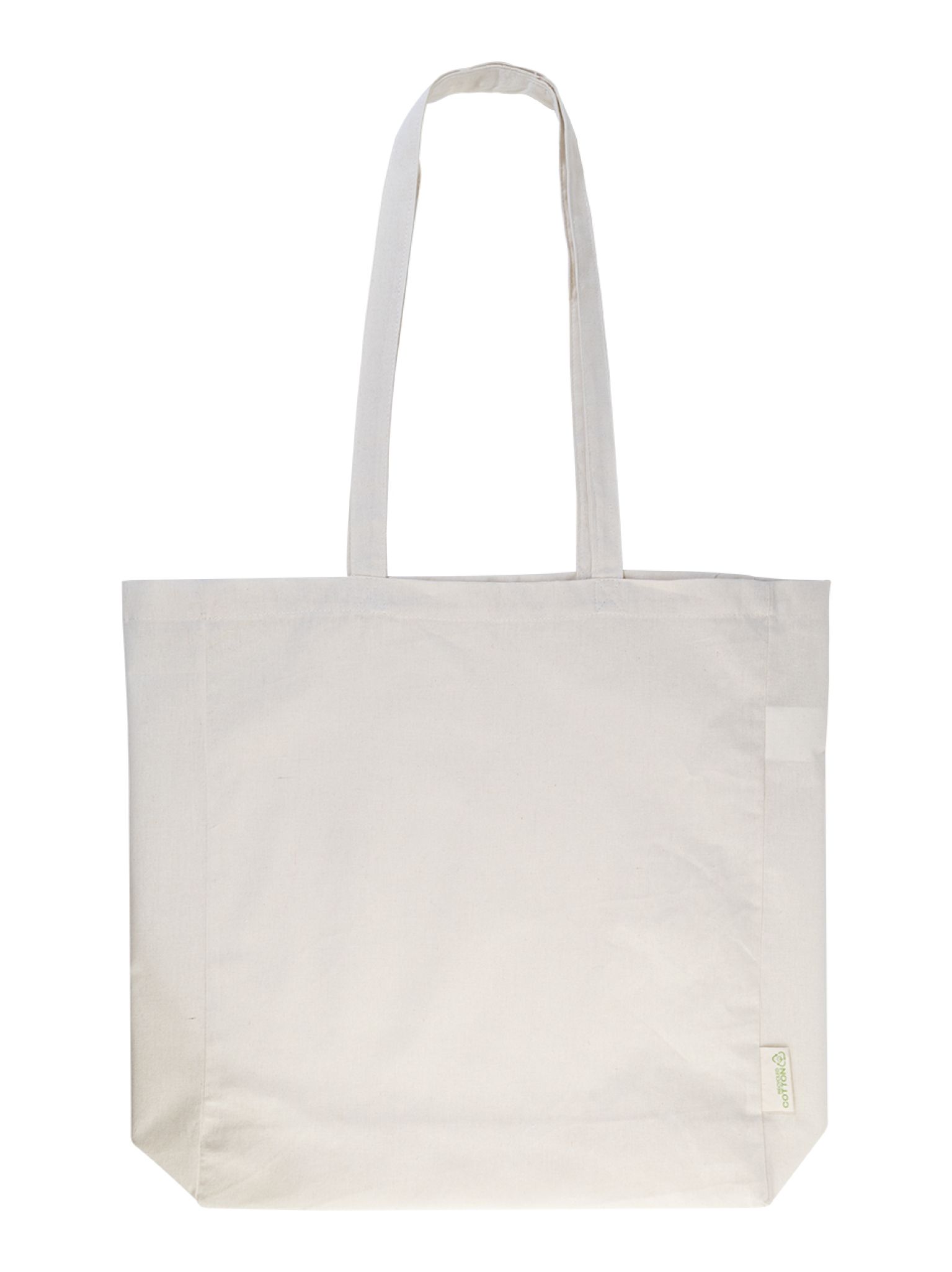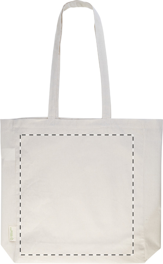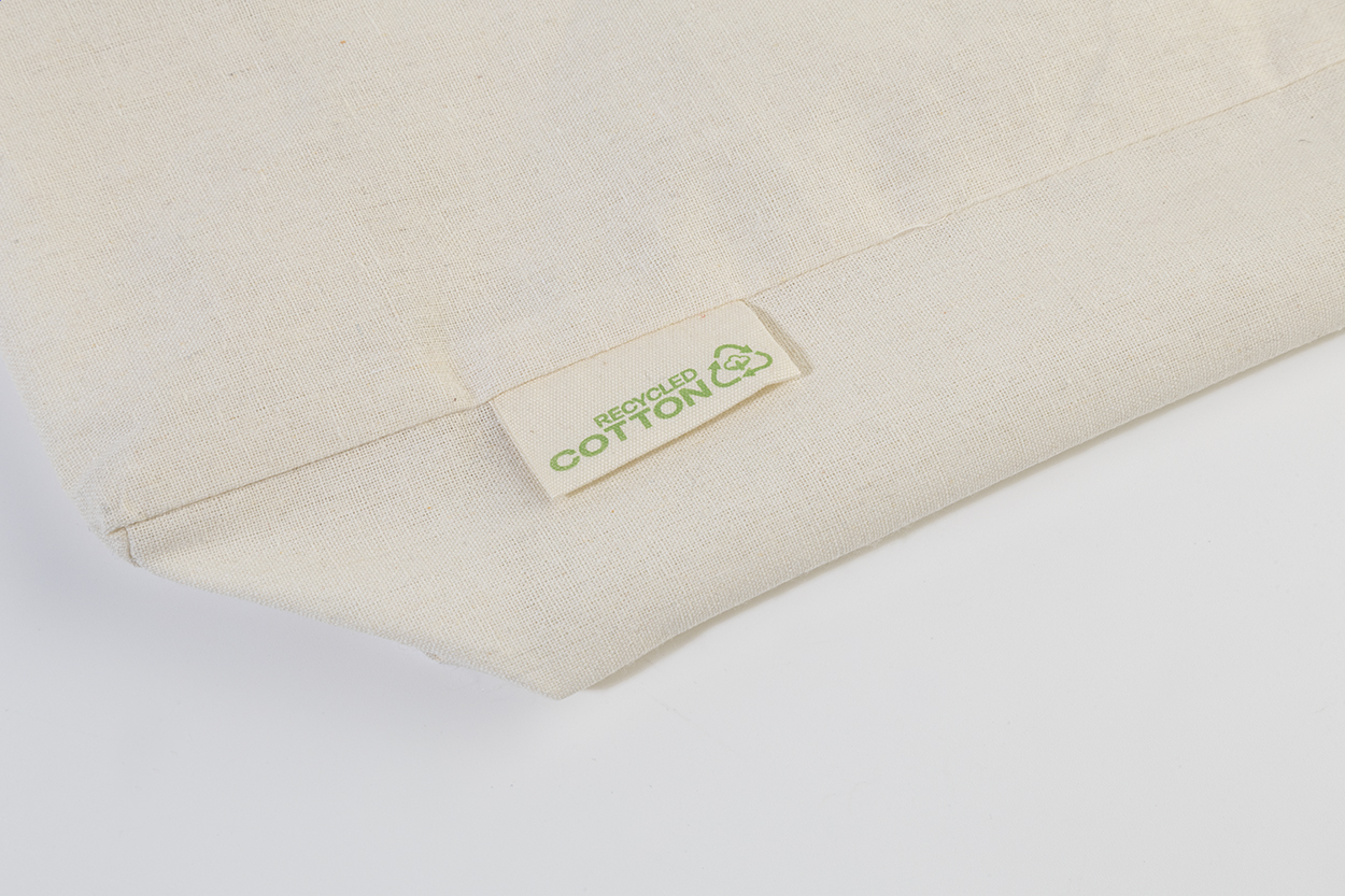 Bevásárlótáska betoldással és hosszú fülekkel, 70% újrahasznosított pamutból és 30% RPET poliészterből, 140 g/m². Megkülönböztető újrahasznosított pamut címkével.