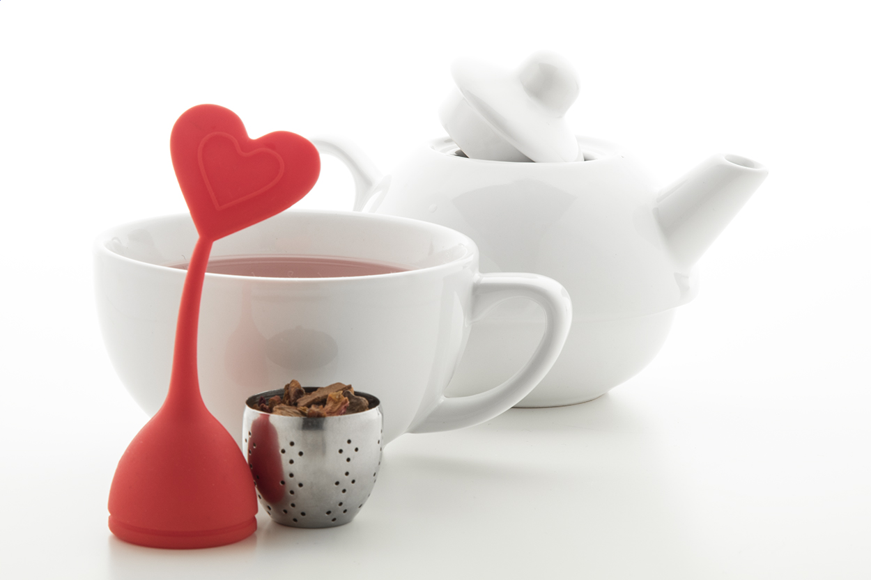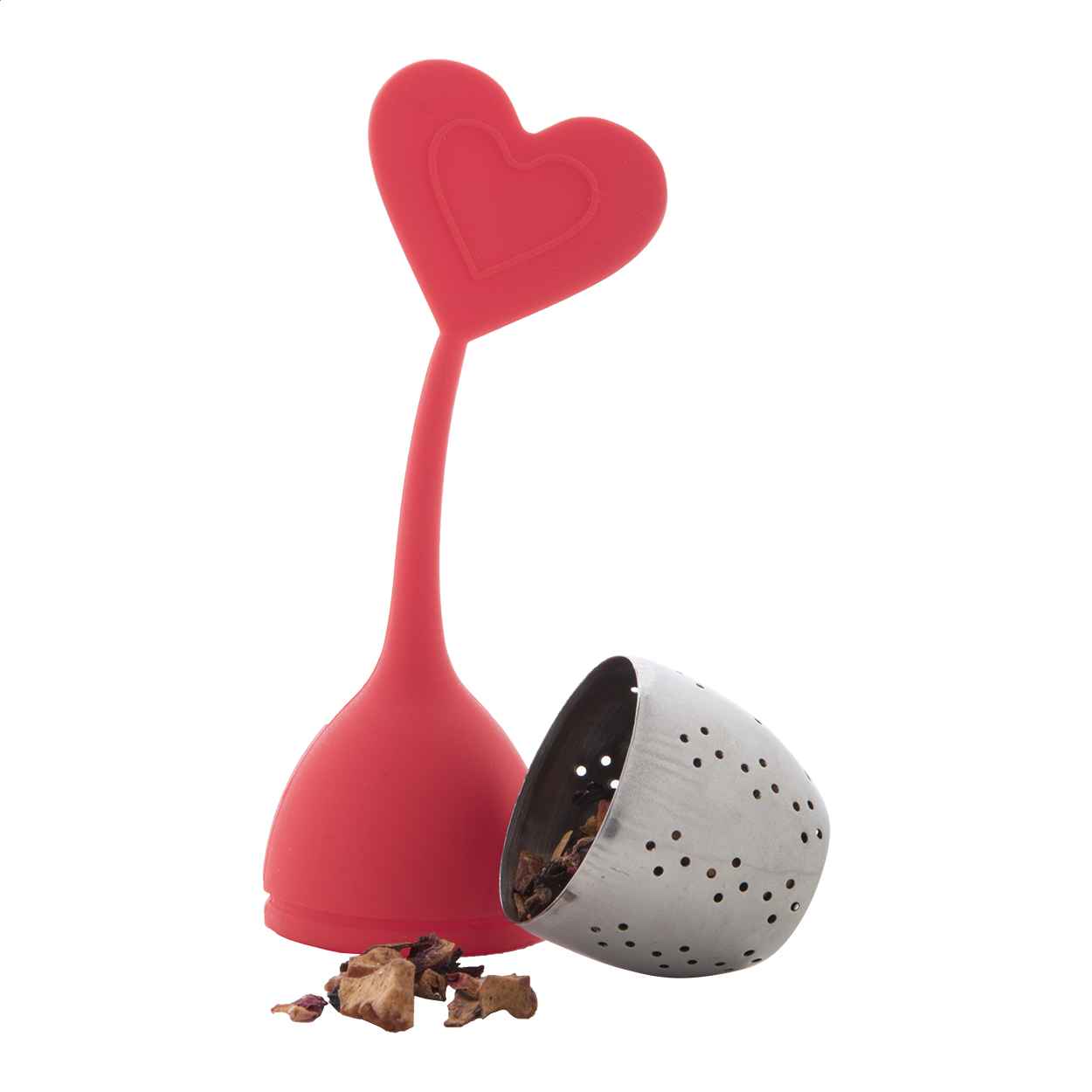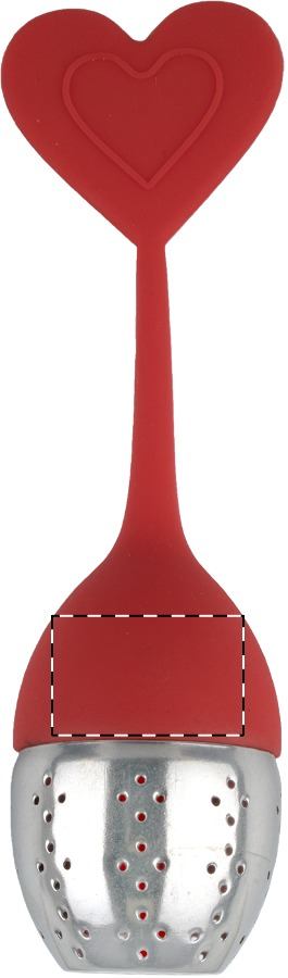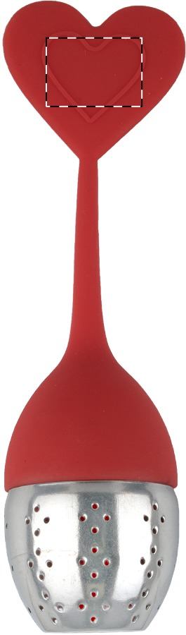 Szilikon és rozsdamentes acélból készült teatojás, a tetején díszítéssel.