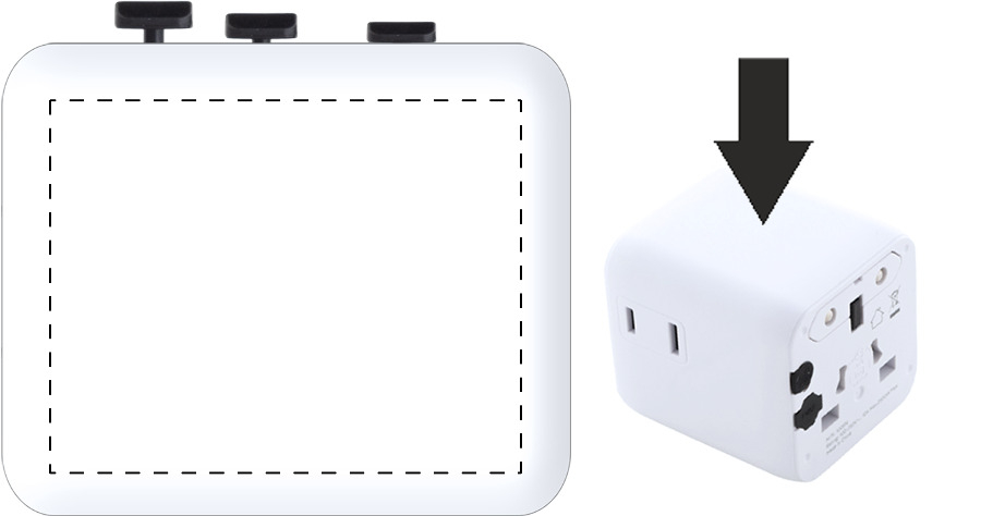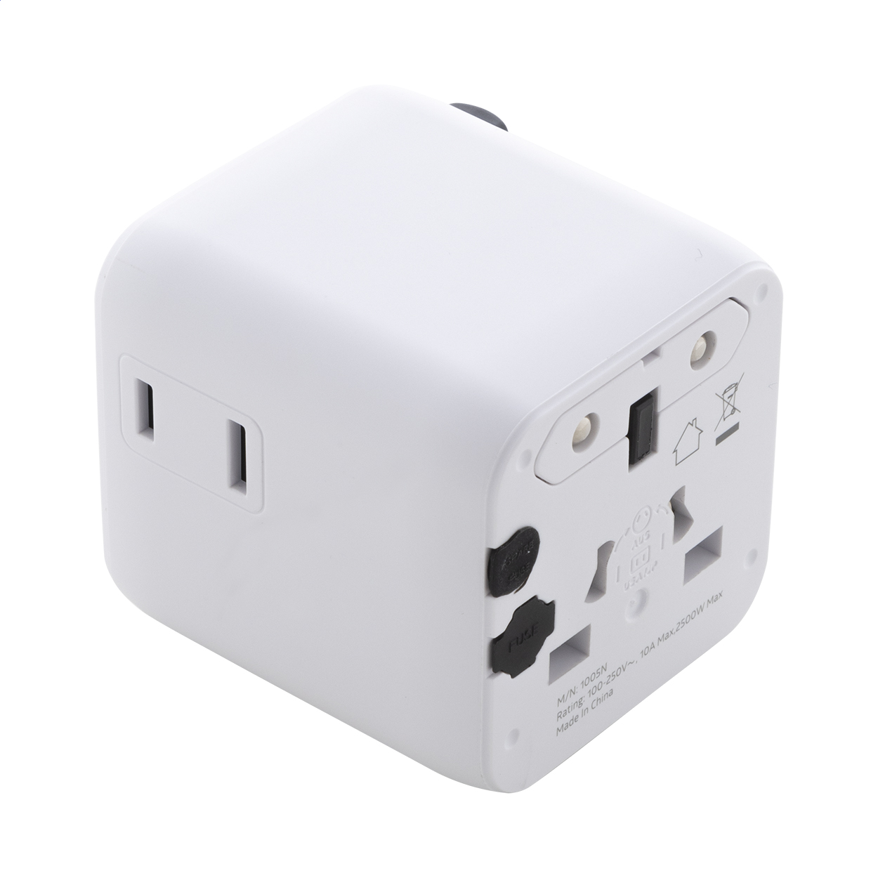 Ultrakompakt, univerzális, világszerte használható utazási adapter újrahasznosított PC-műanyagból, beépített fali csatlakozókkal az USA, Európa, Egyesült Királyság és Ausztrália látogatására.