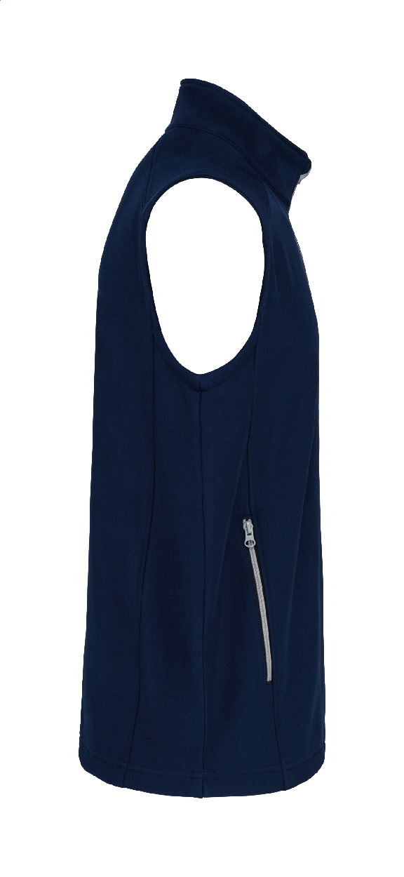 Kétrétegű, cipzáras softshell testmelegítő mellény cipzáras oldalsó zsebekkel. Kontrasztos cipzárakkal. Vízlepergető anyagból. Külső: 95% poliészter és 5% elasztán. Belső: 100% poliészter mikro polár gyapjú. 300 g/m². Kariban márkatermék.