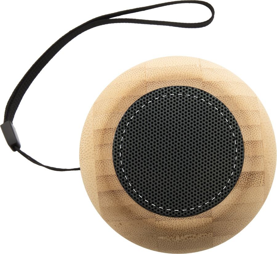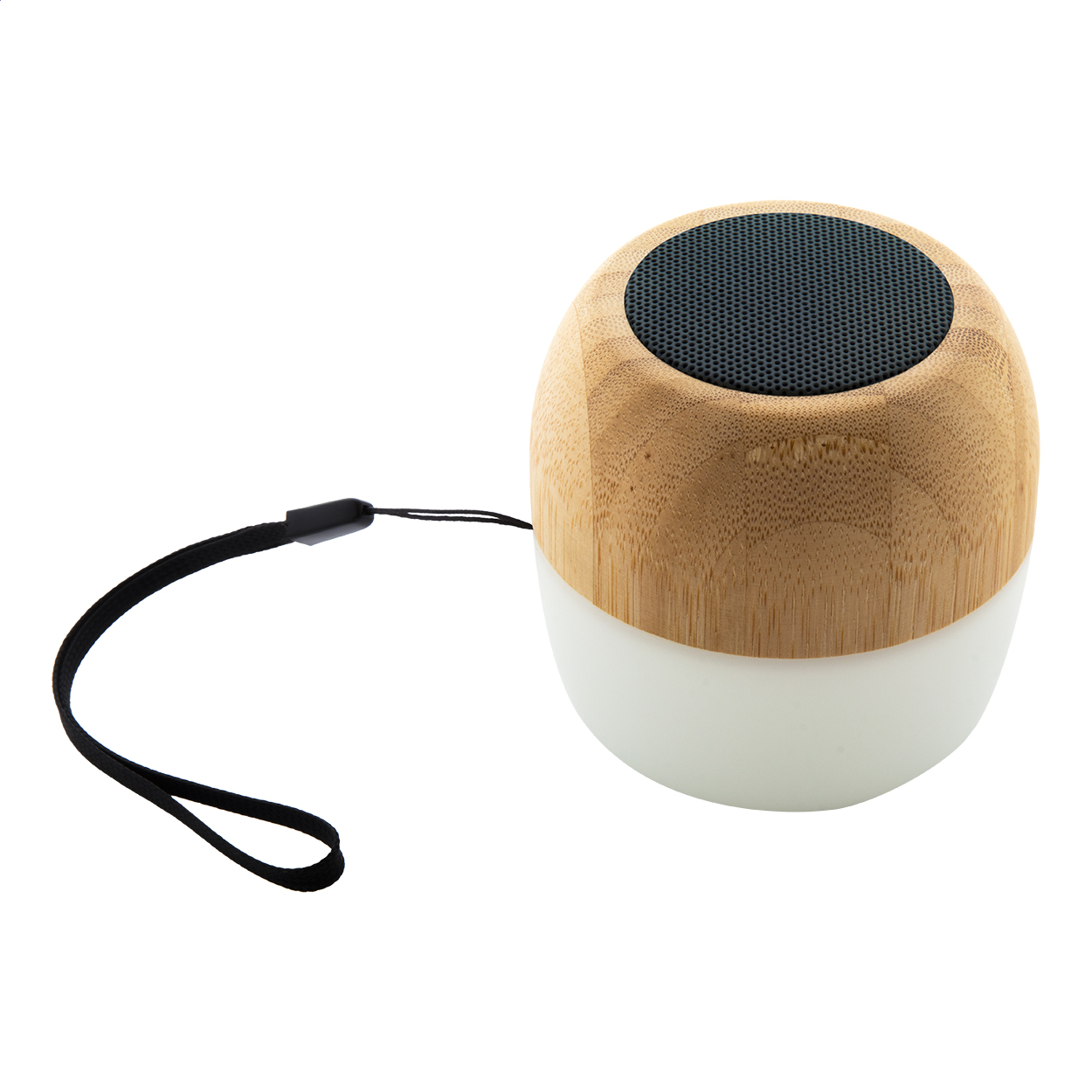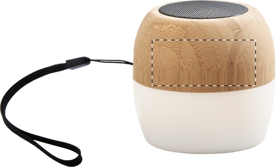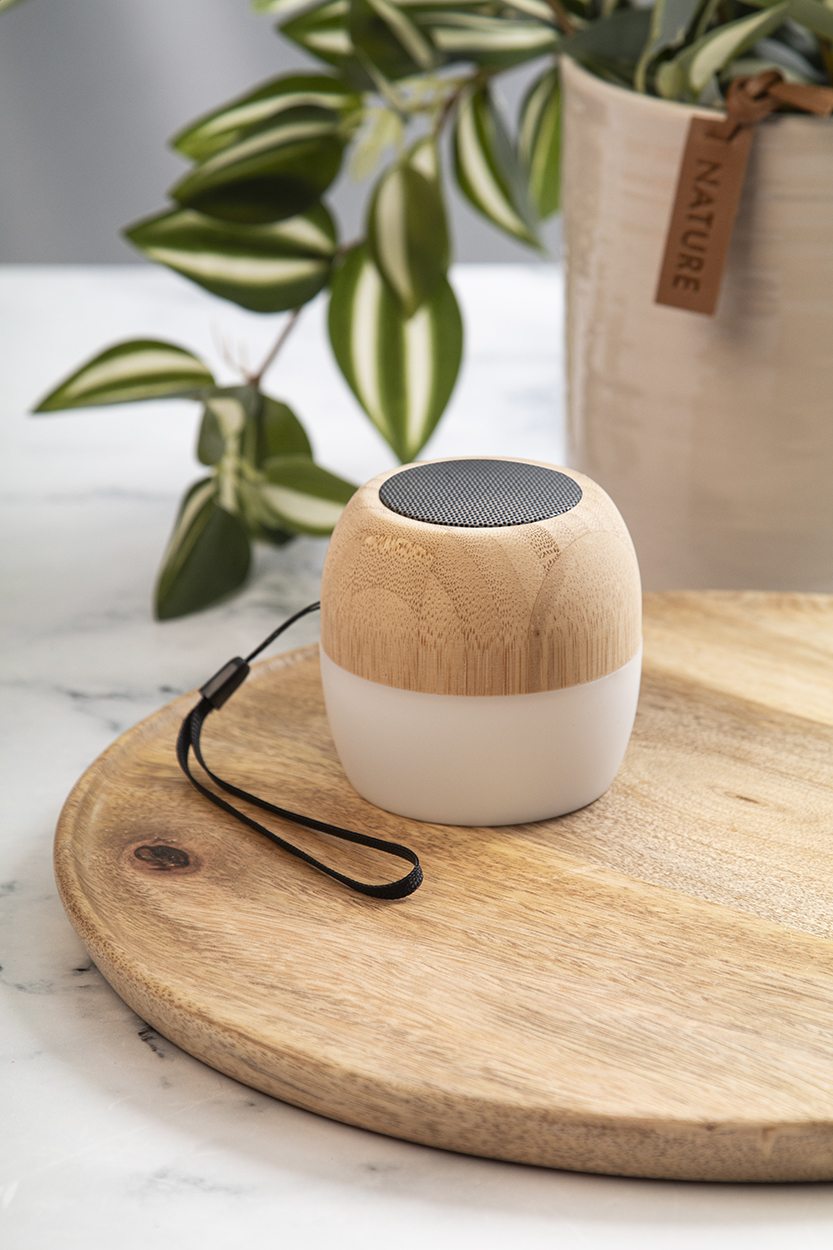 Vezeték nélküli hangszóró újrahasznosított ABS műanyag és bambusz borítással, többszínű LED lámpával az alján. Hordszíjjal és beépített újratölthető akkumulátorral. USB töltőkábellel szállítjuk.