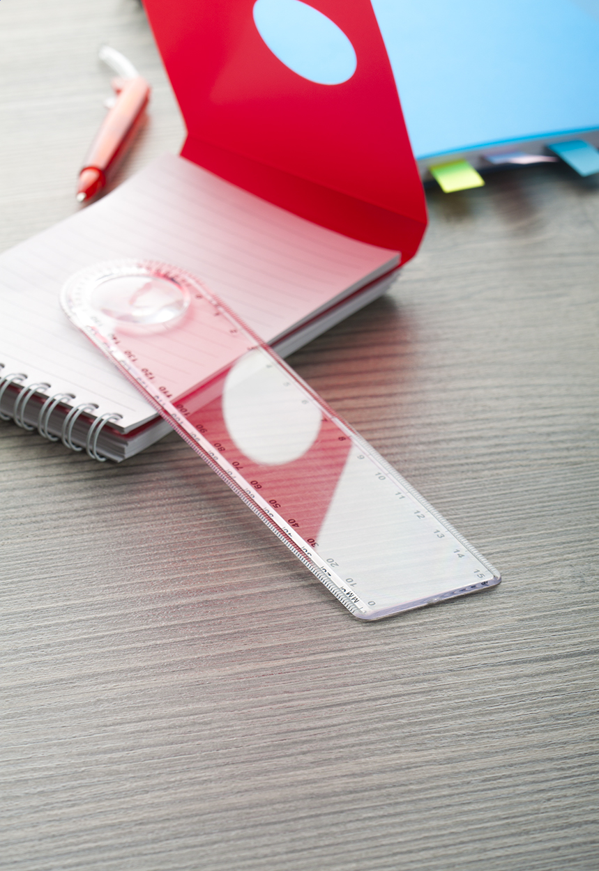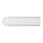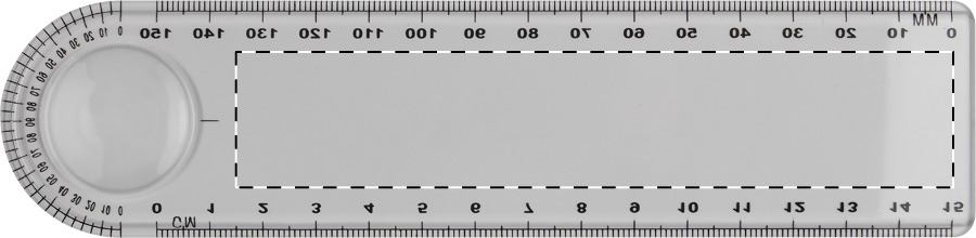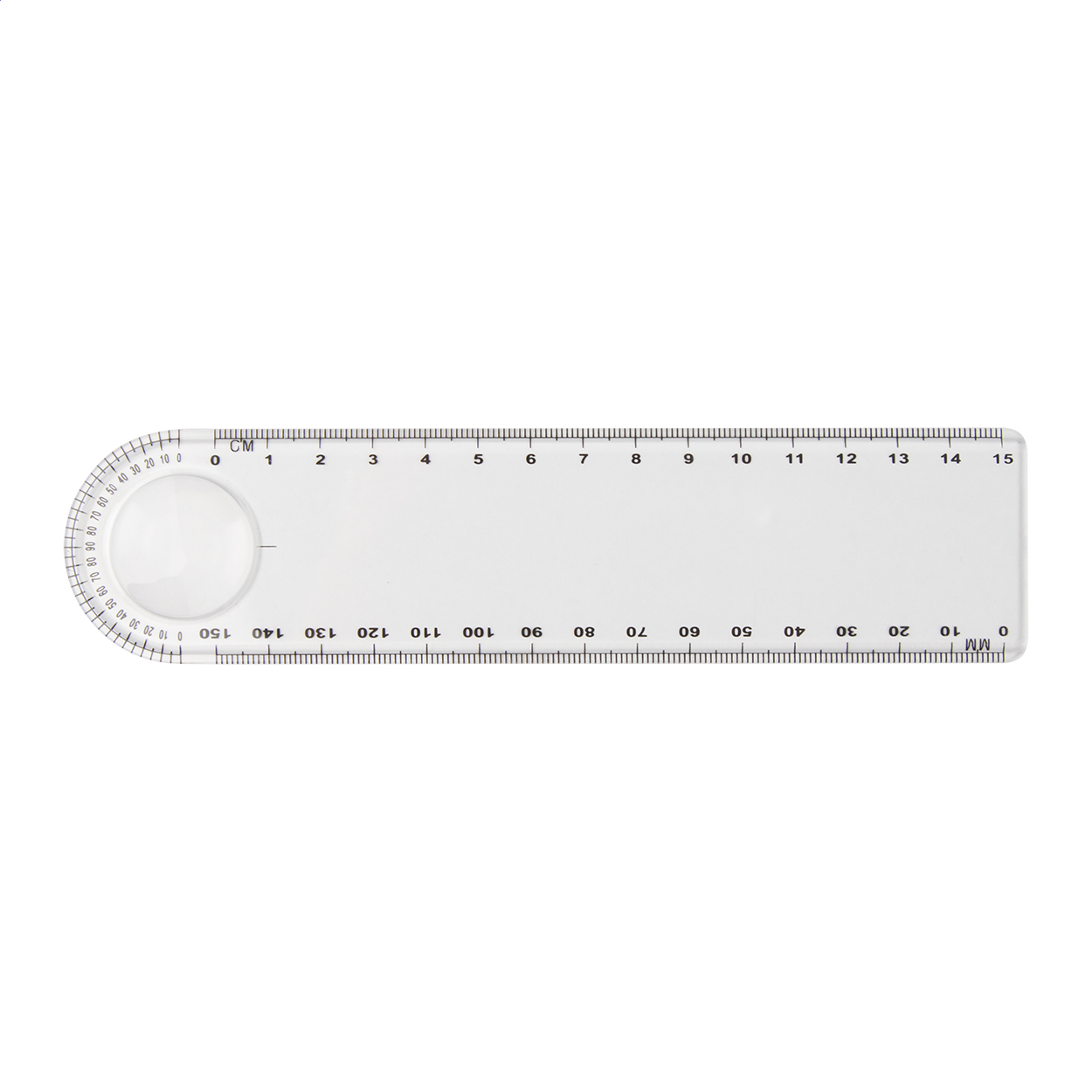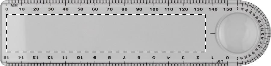 15 cm-es műanyag vonalzó nagyítóval és fokmérővel (cm és mm skálával).