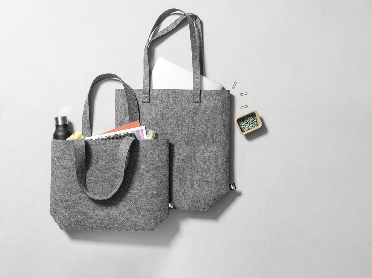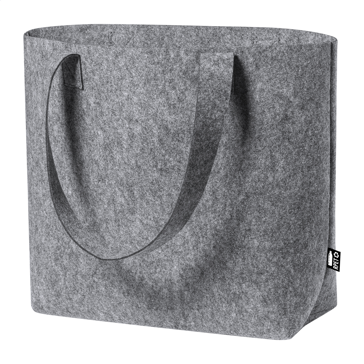 RPET filc anyagú bevásárlótáska betoldással és közepes hordfüllel. Megkülönböztető RPET címkével ellátva.