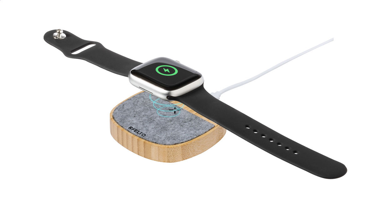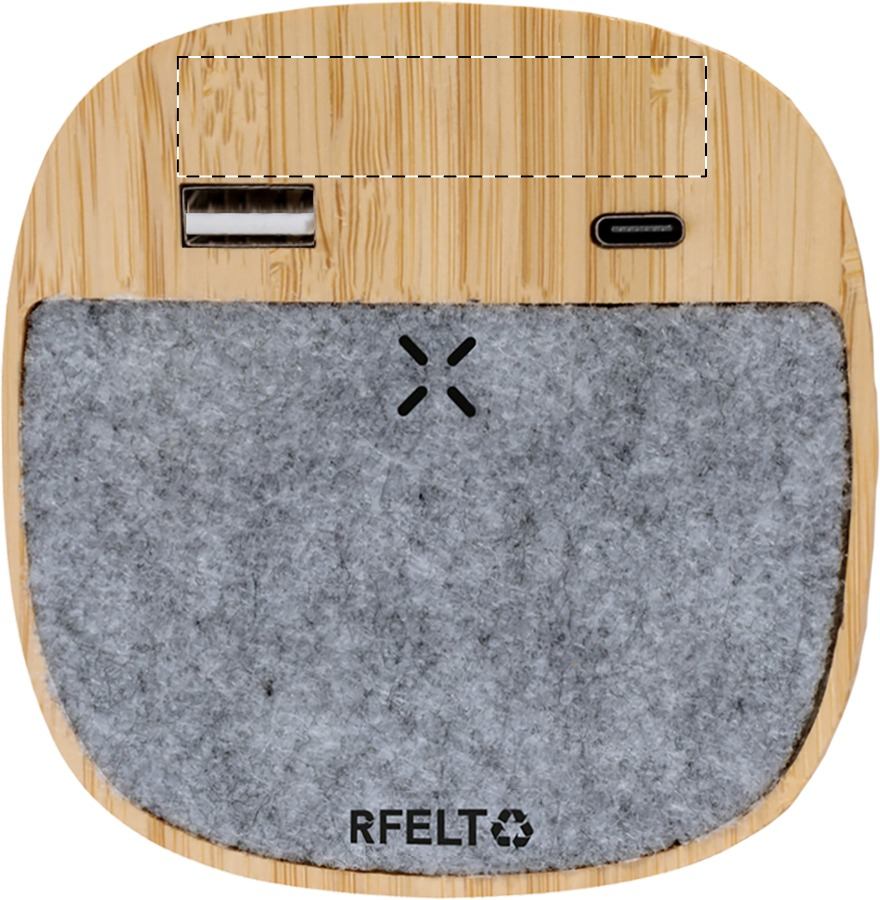 Vezeték nélküli gyorstöltő (15W) bambusz és RPET filc házban. 1 USB és 1 USB-C töltőporttal az egyidejű vezetékes és vezeték nélküli töltéshez. USB töltőkábellel szállítjuk.