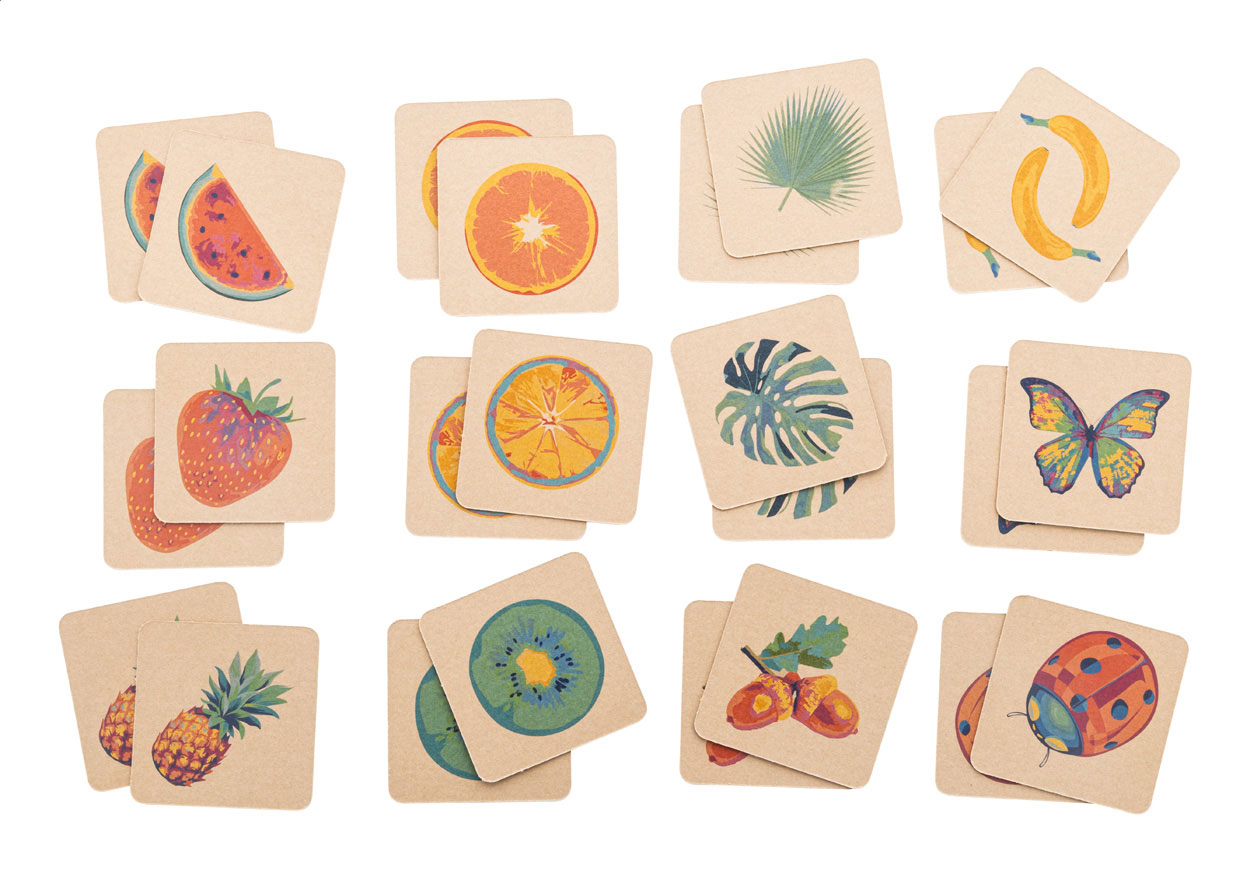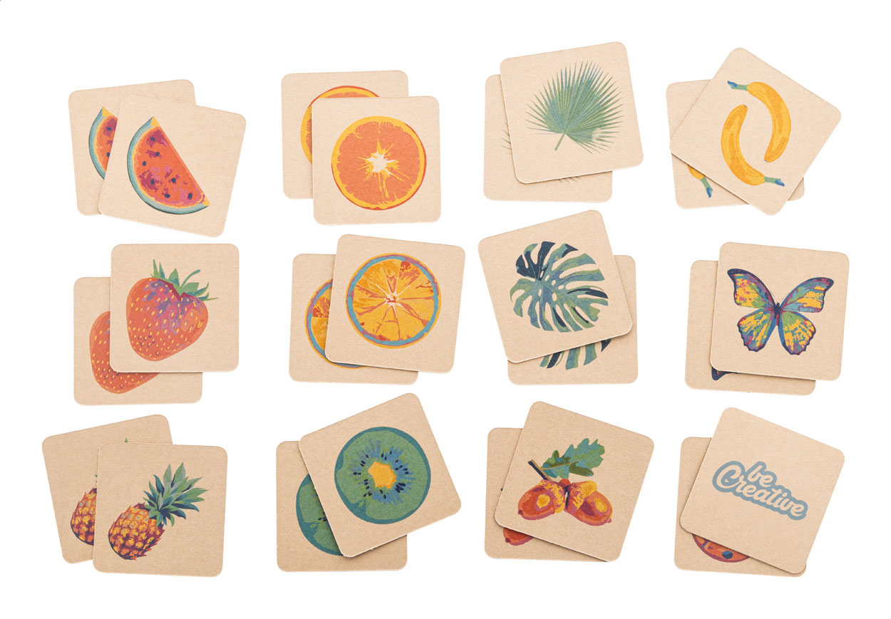 Egyedi gyártású, kraft papír memóriajáték egyedi kraft papír dobozban. 24 lapkával (55×55 mm). Az ár tartalmaz 12 különböző full colour nyomatot a lapka elülső oldalán, 1 full colour nyomatot az összes csempe hátoldalán és egy full colour nyomtatású dobozt.Minimális rendelési mennyiség: 250 db.