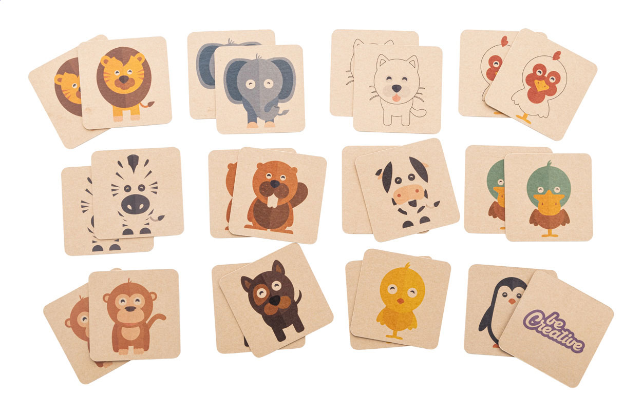 Kraft papír memóriajáték tematikus motívumokkal egyedi kraft papír dobozban. 24 lapkával (55×55 mm). Az ár tartalmazza a full colour nyomtatást az összes lapka hátoldalára és egy full colour nyomtatott dobozt.Minimális rendelési mennyiség: 100 db.