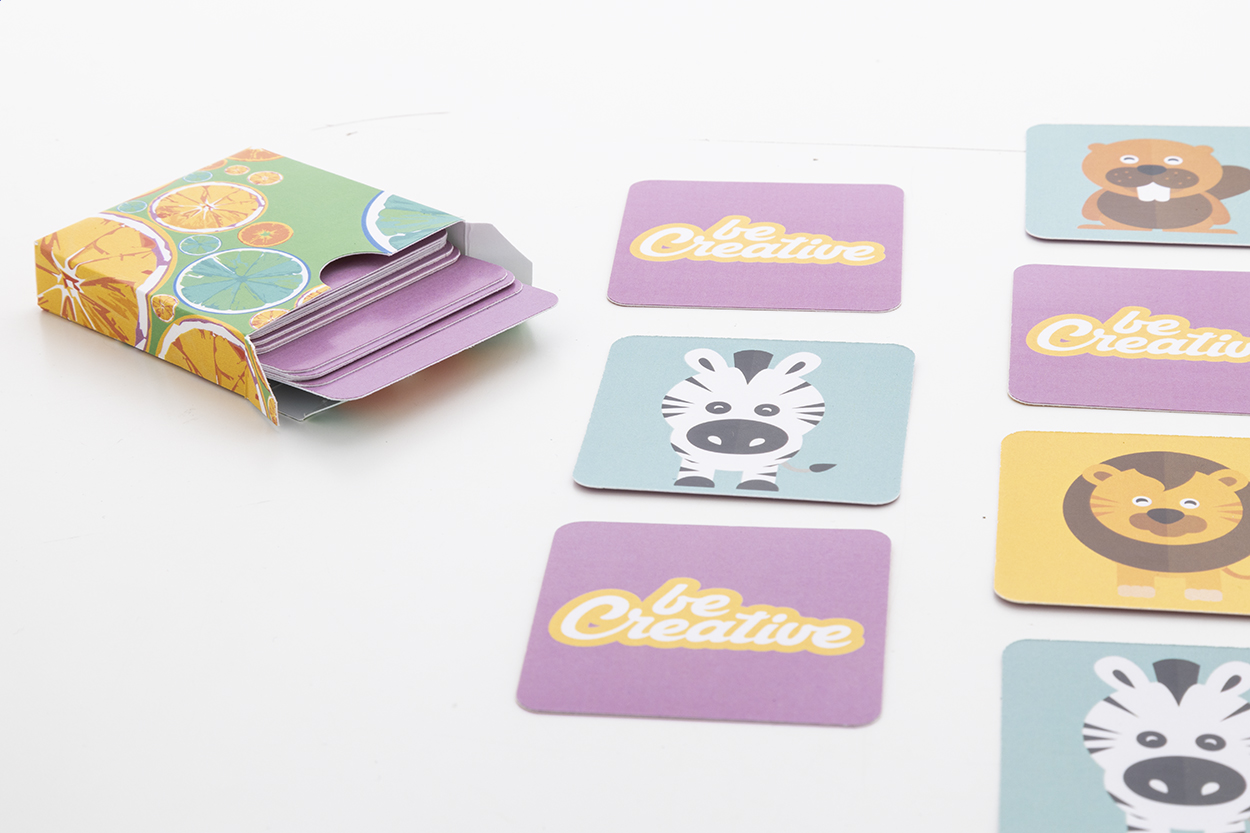 Papír memóriajáték tematikus motívumokkal egyedi papírdobozban. 24 lapkával (55×55 mm). Az ár tartalmazza a full colour nyomtatást az összes lapka hátoldalára és egy full colour nyomtatott dobozt. Minimális rendelési mennyiség: 100 db.