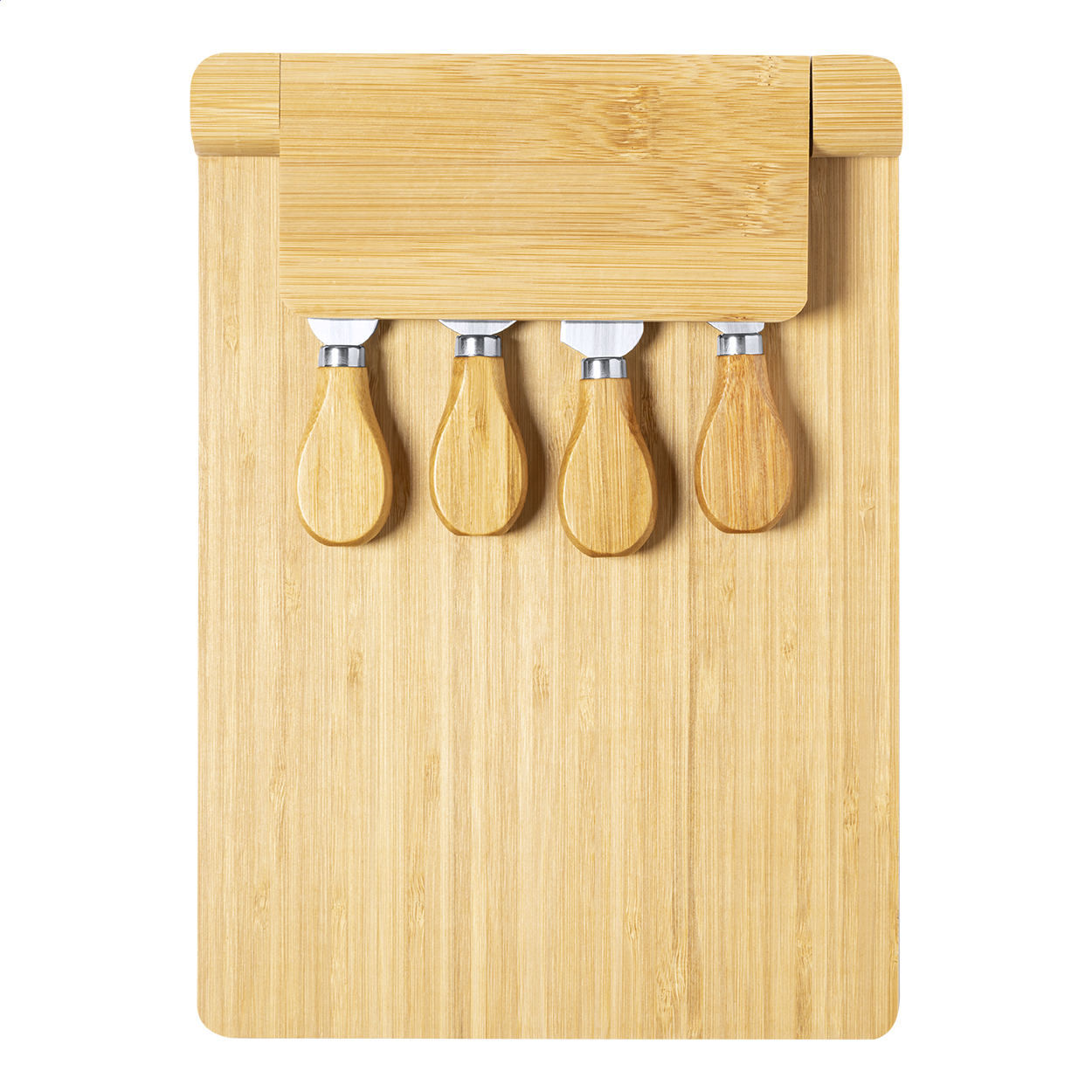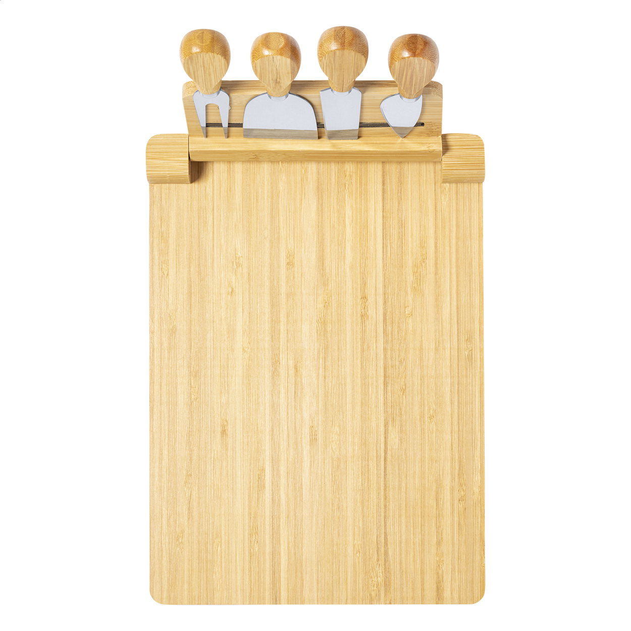 Bambusz vágódeszka 4 db-os rozsdamentes acél sajtkés szettel, összecsukható mágneses tartóval.