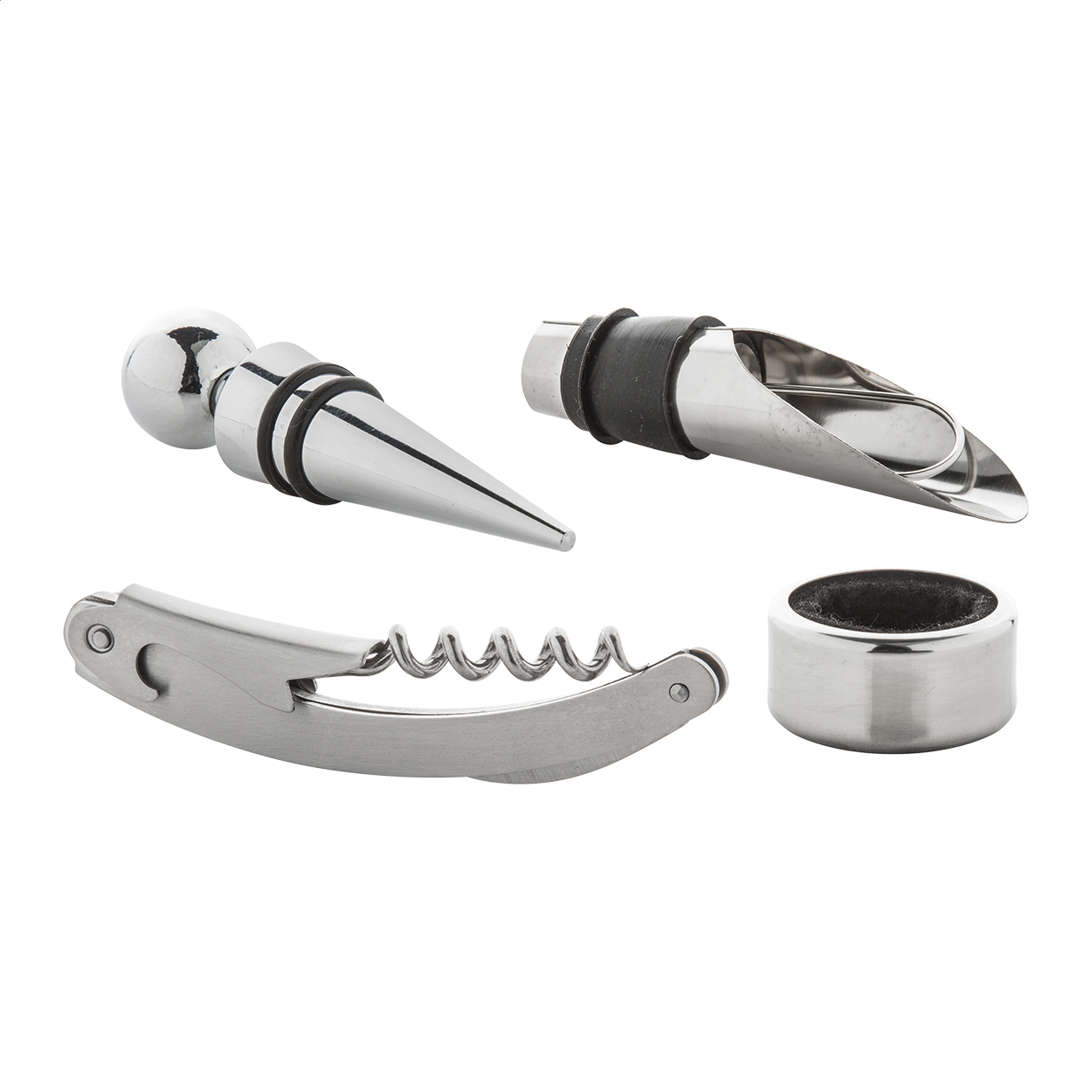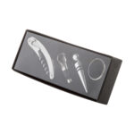 4 részes boros szett, mely dugóhúzót, cseppőrt, dugót és kiöntőt tartalmaz. Fekete díszdobozban szállítjuk.