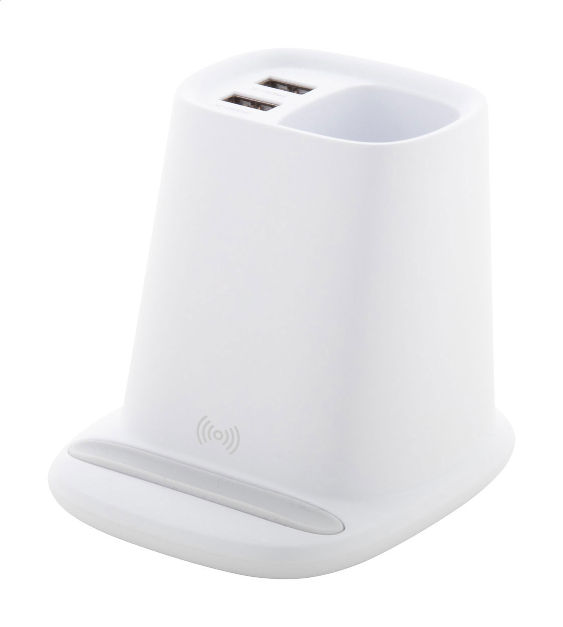 Műanyag multifunkciós asztali tolltartó mobiltelefon tartóval, beépített vezeték nélküli gyorstöltővel (10W) és 2 USB porttal (max. kimenet: 2000 mA). USB töltőkábellel szállítjuk.