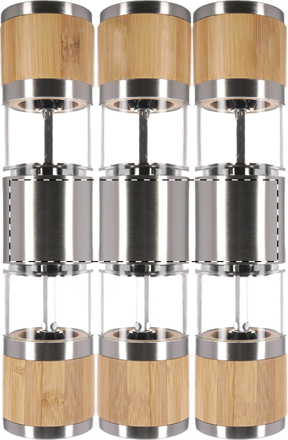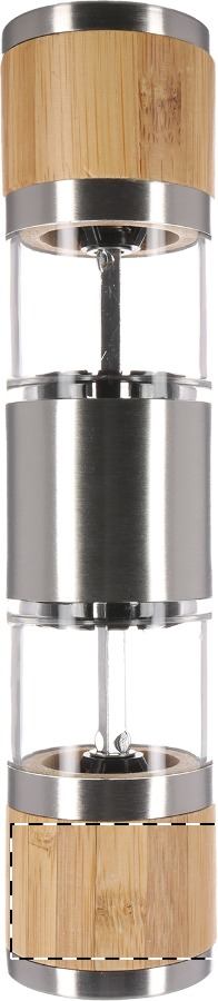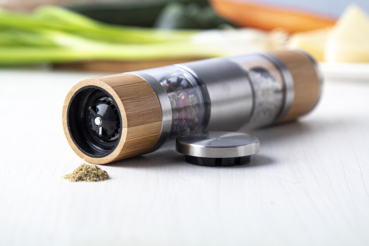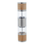 Rozsdamentes acélból készült kézi só- és borsőrlő, bambusz borítással és kerámia őrlőszerkezettel.